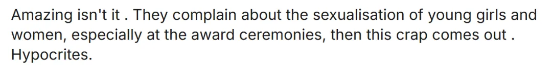 “真是令人匪夷所思。一边抱怨年轻女孩和女性被性化,尤其是在颁奖典礼上,一边又爆出这种丑事。真是虚伪。”