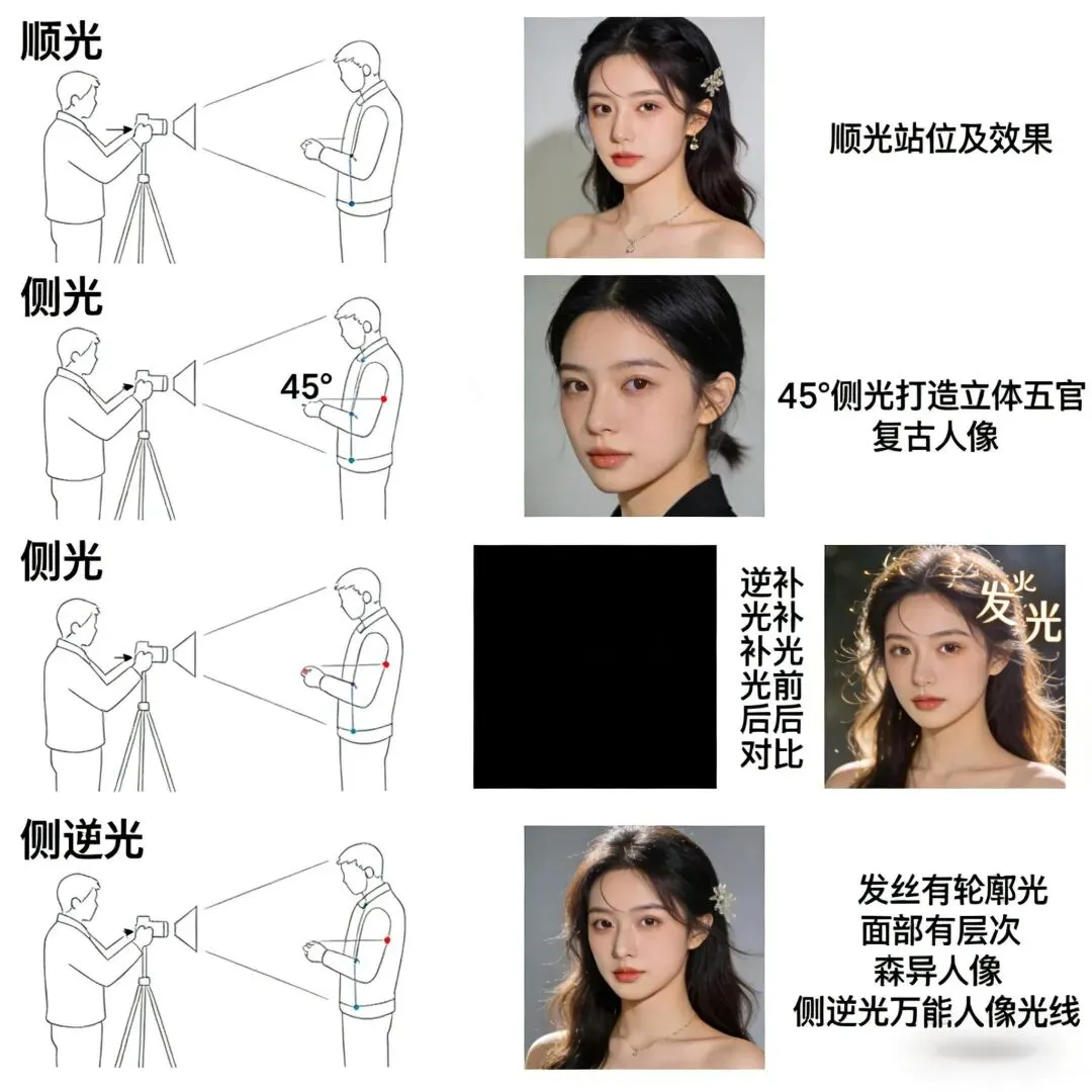 效果:明暗层次分明,能突出脸部轮廓和五官立体感,适合拍复古、氛围感人像。