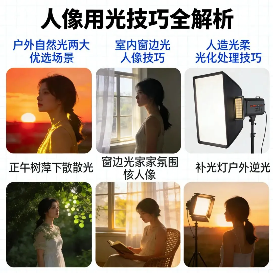 光线是人像摄影的灵魂,不同光线能塑造出完全不同的人物气质,核心在于控制光线的软硬、方向和强度。