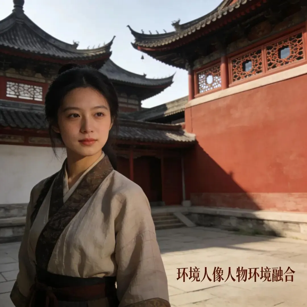 环境人像:将人物置于环境中,人物占画面1/3~1/2,突出人物与环境的融合感(如旅拍、古风外景)。
