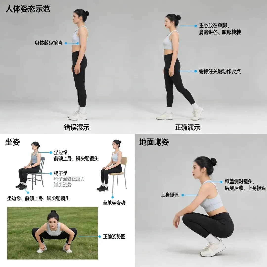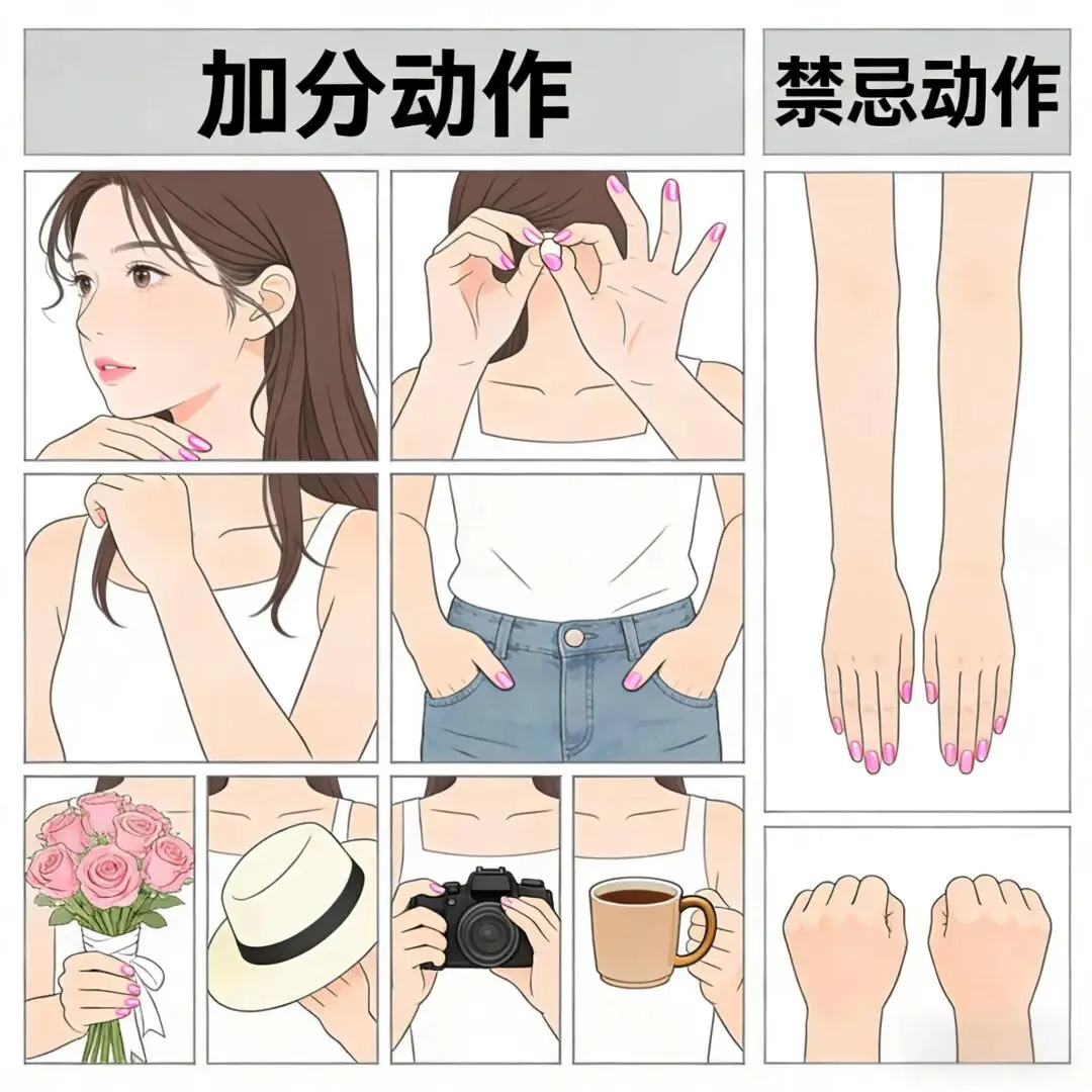 - 实用手部动作:撩头发、摸耳朵、托下巴、插口袋、拿道具(花束、帽子、相机、咖啡杯);