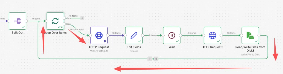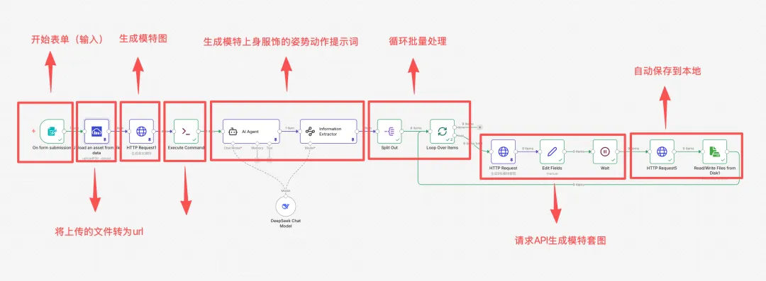 基于这种情况,我们就可以在自己的电脑上部署一个n8n的自动化工作流,能够完成电商模特套图的批量生产