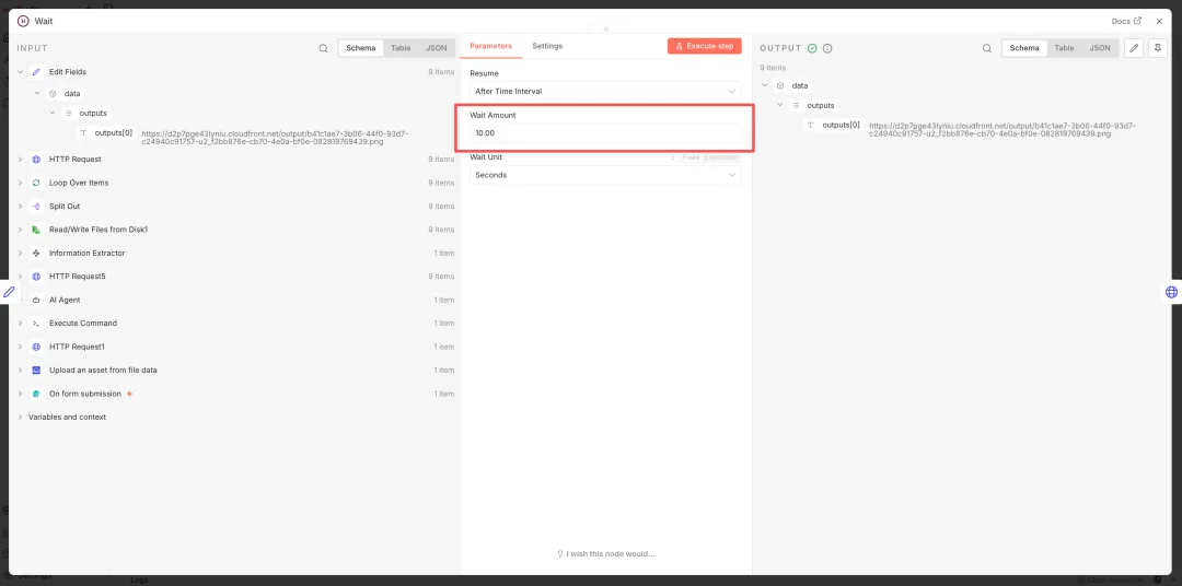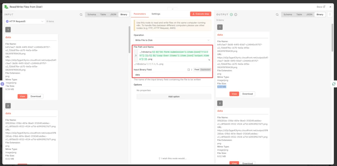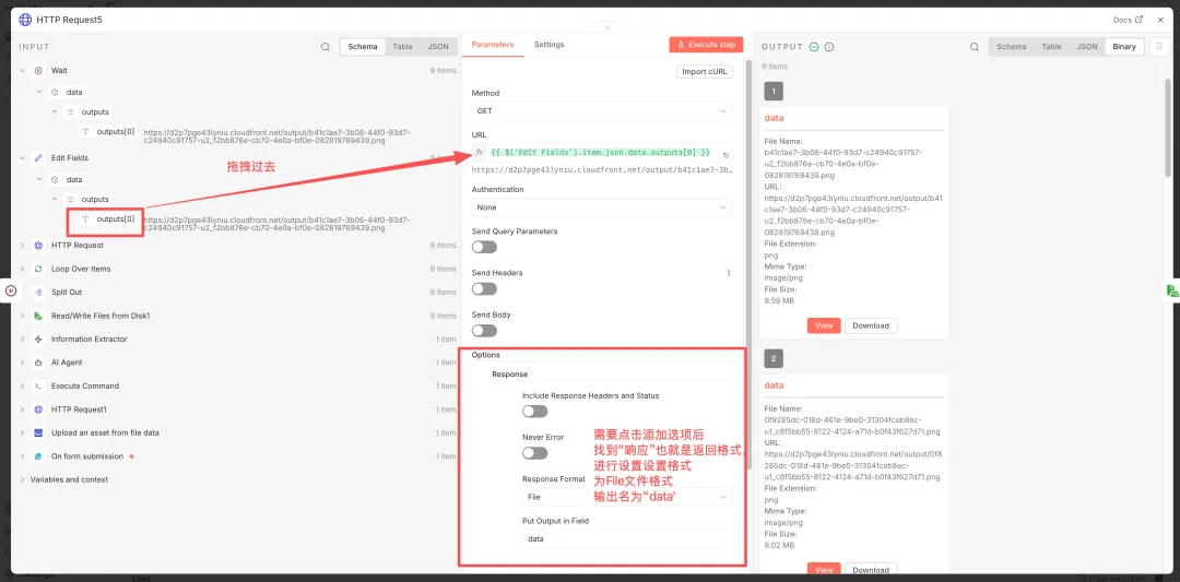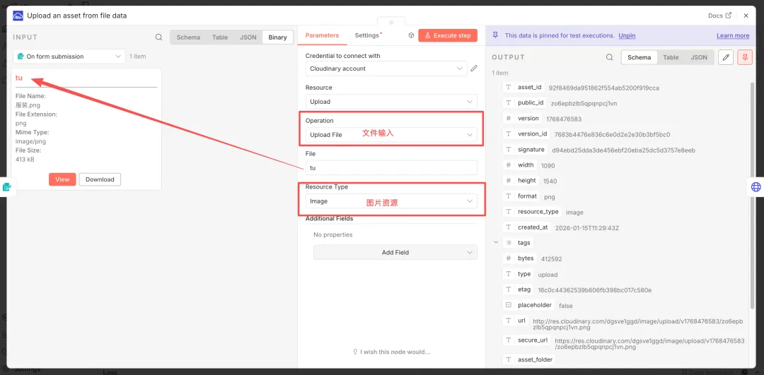 为什么要上传云端呢?其实是因为我们本地部署的n8n没有在线服务的功能,所以需要将本地的二进制文件变成可在线查看的链接,以便后续API请求节点根据图片生成新的图片