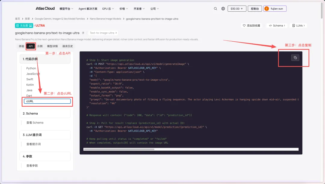 这里我用的是Atlas Cloud平台,这个平台的API调用比较稳定,而且质量非常高,没有被阉割的感觉。