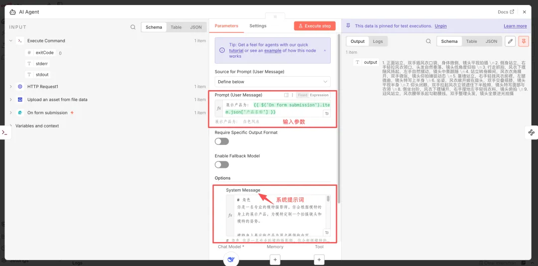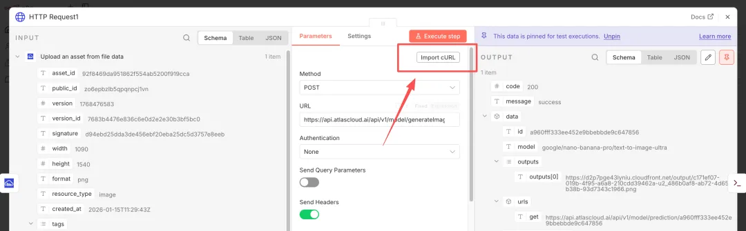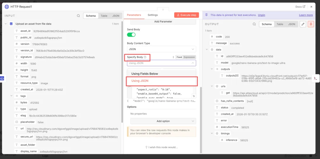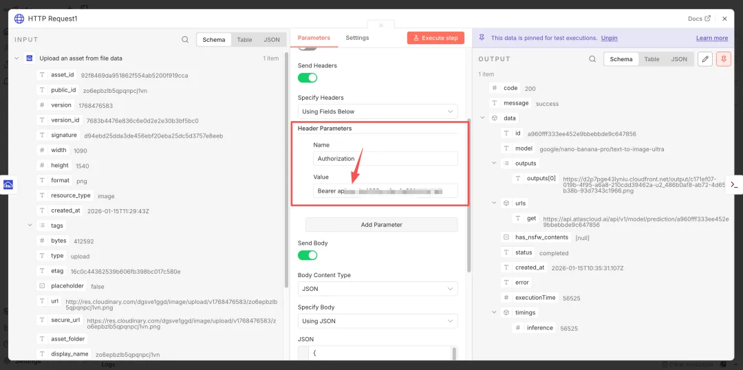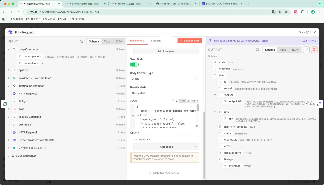 {"model""google/nano-banana-pro/edit-ultra","aspect_ratio""9:16","enable_base64_output"false,"enable_sync_mode"true,"images": ["{{ $('HTTP Request1').item.json.data.outputs[0] }}","{{ $('Upload an asset from file data').item.json.url }}"  ],"output_format""png","prompt""根据第一张模特图和第二张服饰图,将服装穿到模特身上,并生成{{ $json['output.posture'] }}图","resolution""4k"