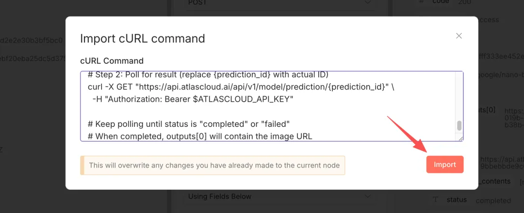 这个板块是使用的HTTP请求节点,请求拥有调用Nana banana API模型的平台这里的使用也不算太难,我们可以一键把指令导入。