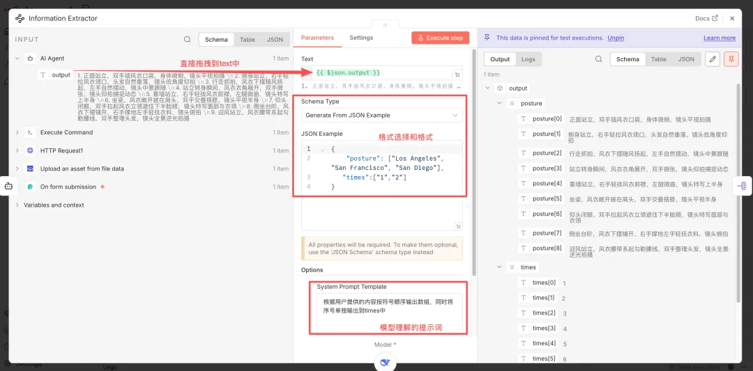 这个板块是用的AI Agent节点和Information Extractor(信息提取节点),来生成模特姿势的prompt并进行格式处理。