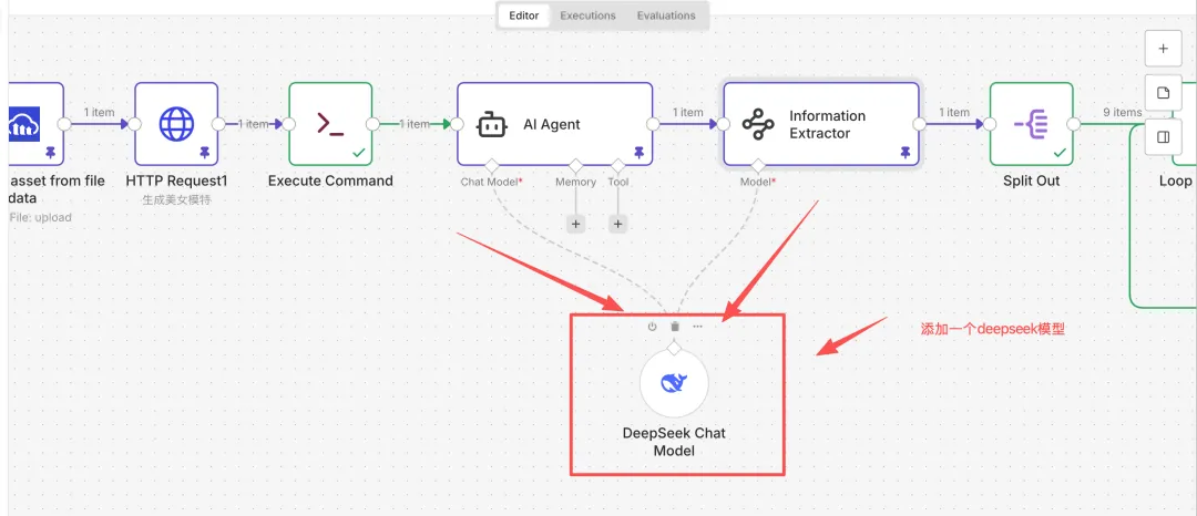 同时在这两个节点下,有两个尾巴是需要添加模型的,点击添加后会有很多种模型选择这里呢,推荐使用deepseek模型,因为API的授权比较方便。