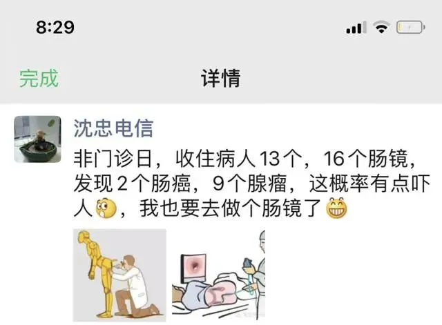 听好闺蜜推荐,她来到杭州市三医院肛肠外科看沈忠主任的专家门诊。沈忠仔细询问了她的病情并查体后告知,她肚子痛和便血不是痔疮引起的,很可能是肠子里其他的问题,建议做个结肠镜检查,就可以水落石出了。小欣起初有些拒绝,认为自己年纪轻轻不会得什么大病。于是沈忠翻出了不久前自己发的一条朋友圈给她看: