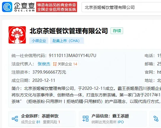 企查查APP显示,北京茶姬餐饮管理有限公司成立于2020年12月,注册资本约3799.97万人民币,由CHAGEE INVESTMENT PTE.LTD.全资持股。