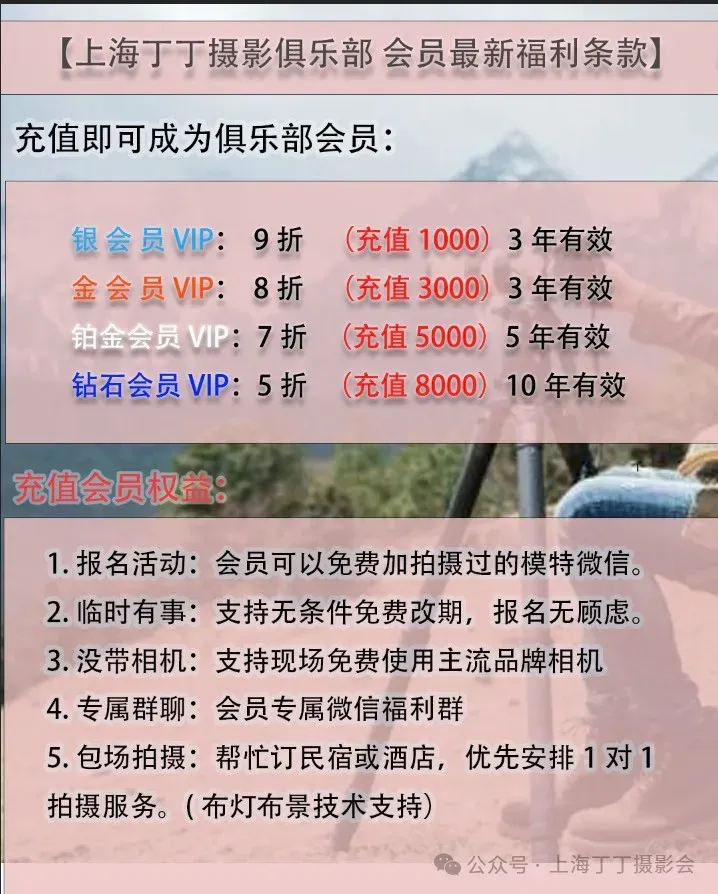 上海丁丁摄影俱乐部(摄影会)成立于2018年,由丁老师全职策划运营带队和影视相关从业人员赞助扶持,以摄影爱好者和新颖题材为主(曾组织过日本、云南、四川、海南岛、东极岛、枸杞岛、长兴岛等旅拍活动),努力做一个百年摄影爱好者俱乐部,传承艺术文化 分享美好瞬间 以摄会友 其乐无穷累计举办过1000场以上摄影爱好者艺术创作活动(活动、旅拍、郊游、交友),俱乐部地址位于上海市静安区甘肃路,欢迎广大摄影爱好者加入。