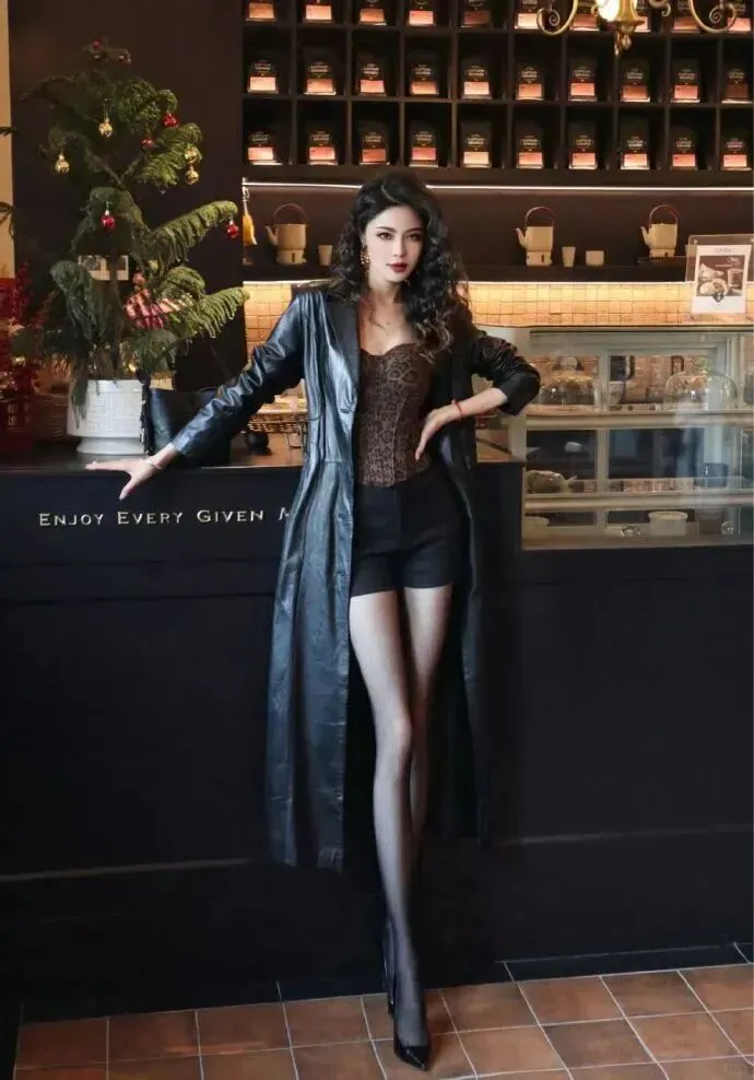 当前位置:首页>美女资讯>黑色长款皮衣+蕾丝内搭+黑丝+尖头红底高跟鞋,酷飒性感,自信明艳的时尚穿搭魅力