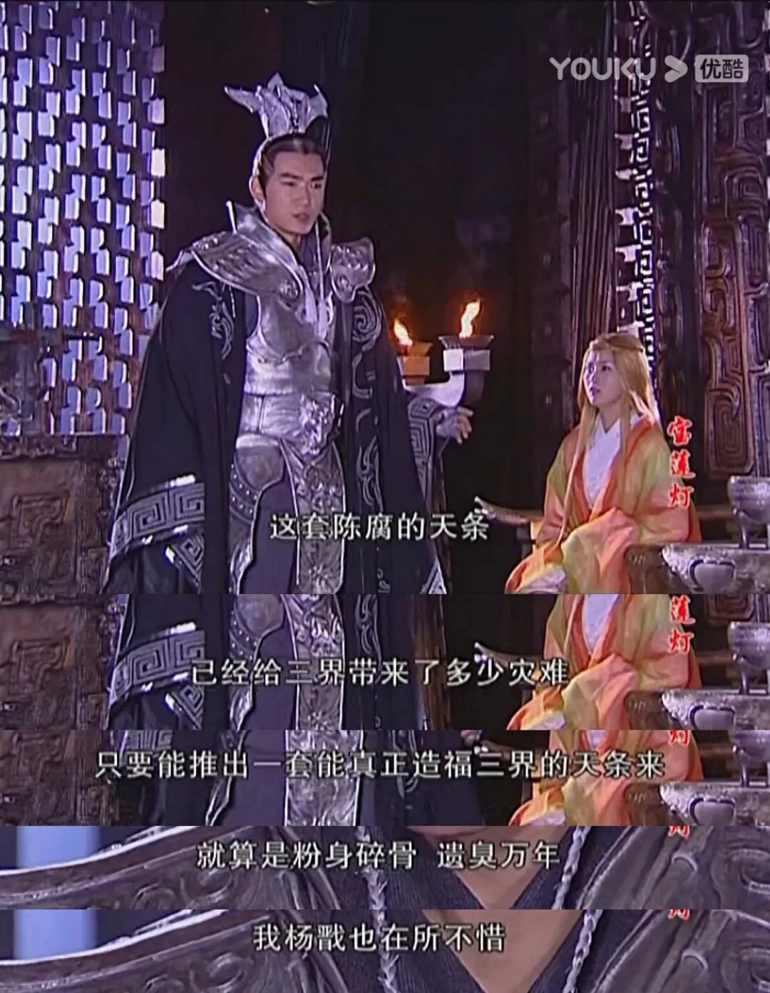 杨戬早已看穿,所谓天规不过是展示权威的工具,“为天下苍生”不过是道德绑架的标语。