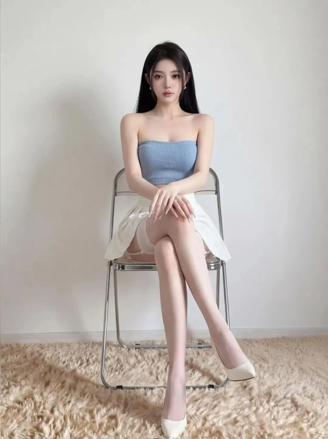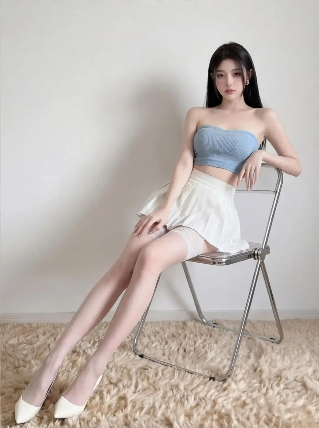 她身着的雾蓝色针织抹胸,是像晴空被揉碎后的淡彩,竖坑条纹的肌理带着针织面料独有的软糯触感,裹胸的剪裁贴合身形,将肩颈与腰腹的线条尽数勾勒,露肤度恰好拿捏着优雅与灵动的平衡;下身的白色百褶短裙,面料轻盈如蝉翼,裙摆的褶皱随着坐姿漾开温柔的弧度,与蕾丝长筒袜的精致花边相映,添了几分柔媚的细节;脚踩的米白色尖头高跟鞋,鞋跟的弧度利落,鞋身的哑光质感与整体的柔调相融,让身形的比例更显高挑。