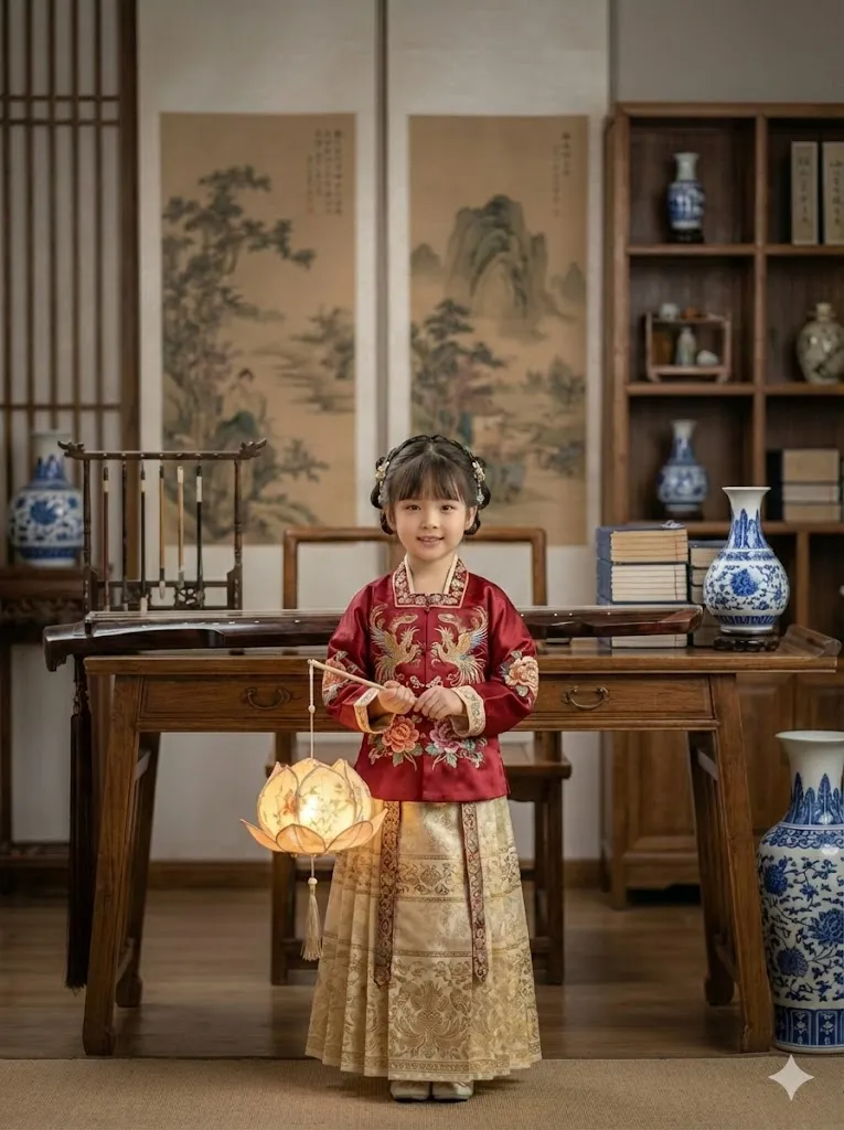 AI绘图指令描述 (Prompt):基于图中人物不变,改变场景和服装:场景是一个精心布置的室内古风书房影棚。背景有古琴、线装书、青花瓷瓶,道具摆放讲究。使用专业的柔光箱光线效果,画面干净、高级,像杂志大片。