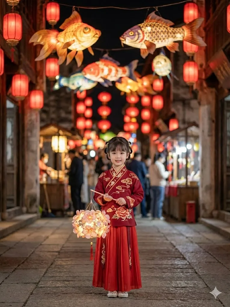 AI绘图指令描述 (Prompt):基于以上人物不变,改变场景和服装:换一套红色的喜庆汉服场景是夜晚的古镇灯会。背景挂满发光的红灯笼和非遗鱼灯,光影斑驳陆离。女孩提着一盏精致的花灯,脸部被灯光柔和照亮。背景虚化要有层次,营造热闹但聚焦人物的感觉。
