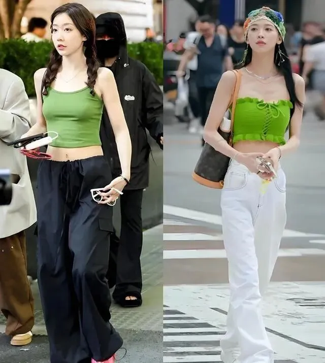 比如一件绿色吊带 , 配黑色或白色裤子。