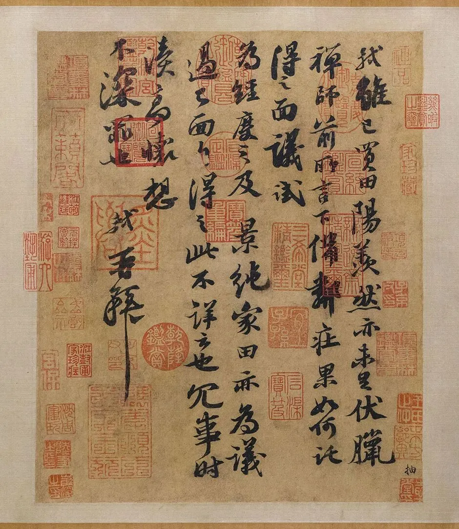 苏轼《阳羡帖》 旅顺博物馆藏   释文:轼虽已买田阳羡,然亦未足伏腊。禅师前所言下备邻庄,果如何,托得之面议,试为经度之。景纯家田亦为议过,已面白,得之此不详云也。冗事时渎高怀,想不深罪也。轼再拜。