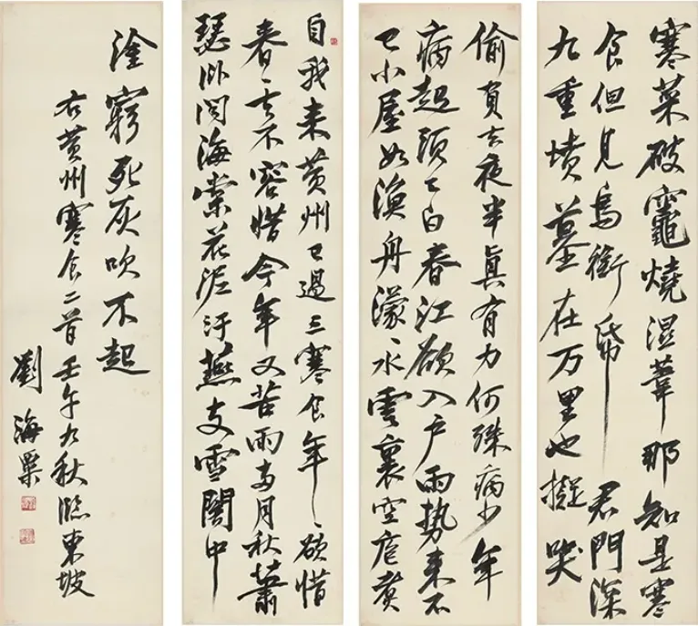 目前可见的刘海粟临摹东坡书法,最早的是1942年临东坡《黄州寒食帖》四条屏,放大临写,是抗战时期刘海粟为募款下南洋,被困于印尼时,每日临池,早上临东坡《寒食帖》,下午临黄山谷《松风阁帖》,此一时期前后且有临文徽明等明人书迹,相比较而言,临东坡《黄州寒食帖》虽说亦试图亦步亦趋东坡书迹,形上亦见扁侧,但反而见出瘦劲处,东坡“屋”“那”等字固有的丰腴亦趋于淡化。