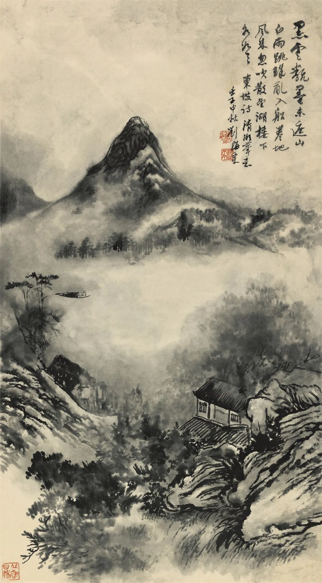 1972年赠英国文化学者静如《东坡诗意图》以清湘笔意写就,款识:“黑云翻墨未遮山,白雨跳珠乱入船。卷地风来忽吹散,望湖楼下水如天。东坡诗,清湘笔意。壬子(1972年)中秋,刘海粟。”