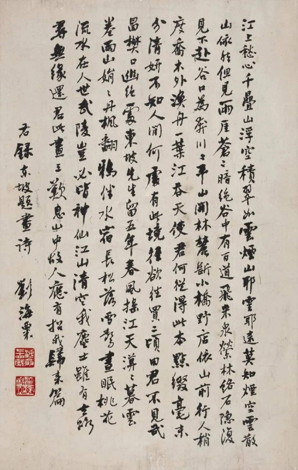 《录东坡题画诗》(未署年代,按书风或为1970年左右):“江上愁心千叠山,浮空积翠如云烟。山耶云耶远莫知,烟空云散山依然……渔舟一叶江吞天。使君何従得此本,点缀毫末分清妍。不知人间何处有此境,径欲往买二顷田。君不见武昌樊口幽绝处,东坡先生留五年……山中故人应有招我归来篇。”此书简直就是老年的刘海粟对东坡《寒食诗帖》与《赤壁赋》的意写致敬,“渔舟一叶”、“归来”等字,俱可见出浓郁的苏味。