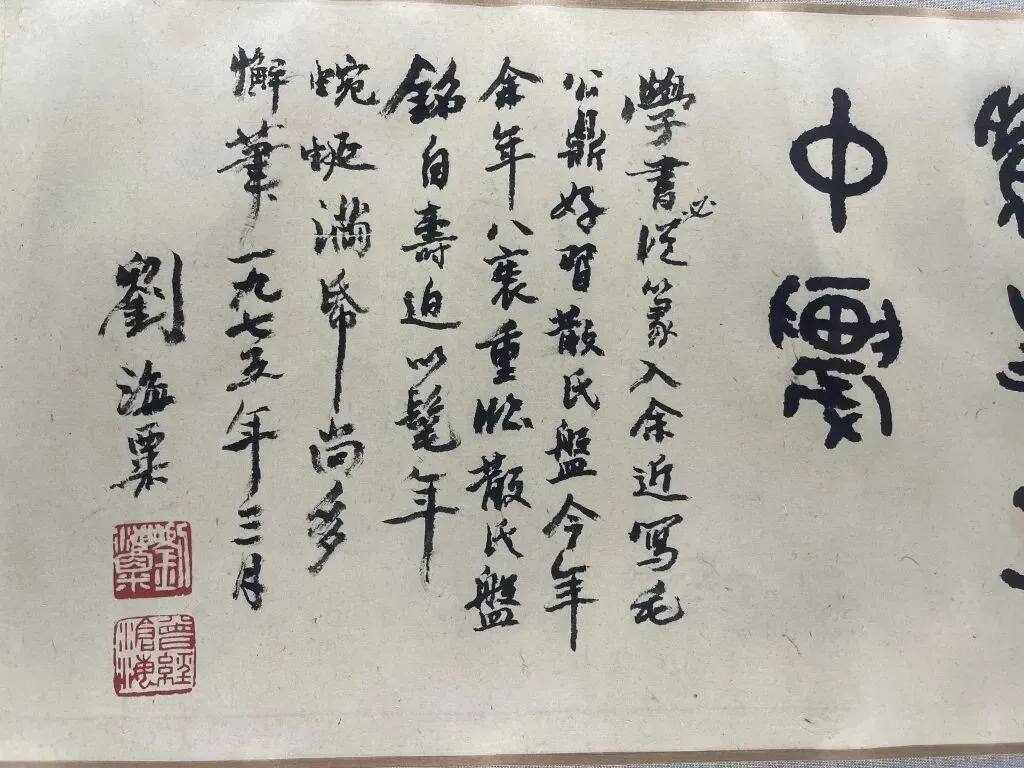 1960年代病中与1970年代,经历了人生巨变,重读钟鼎之文,其书风逐渐开始向碑帖融合、苍莽浑厚一路而去,但其书体尚多帖学余韵,金文苍莽之境虽已渐融入,但尚未至成熟之境。1975年,正值八十大寿之际,刘海粟两次作《临散氏盘铭》,一卷赠友人,一卷自寿,跋言有:“学书必从篆入。余近写《毛公鼎》,好习《散氏盘》。今年余年八秩,重临《散氏盘》自寿,迫以耄年,蜿蜒满纸,尚多懈笔。”