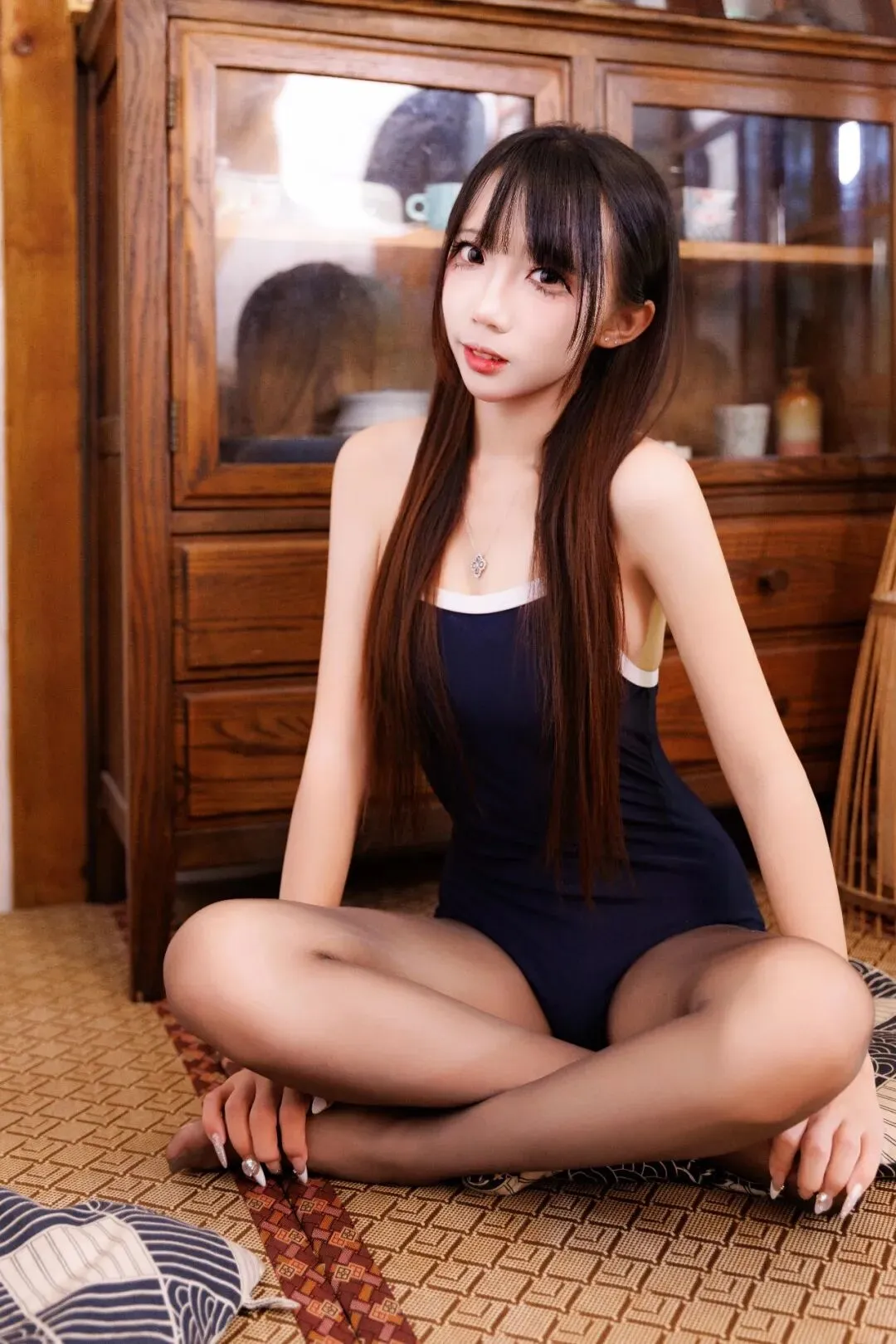 深蓝色连体泳衣搭配白色包边设计,剪裁贴合身形,凸显曲线美感;无袖设计增强肩颈线条,搭配简约项链与透明丝袜,整体造型干净利落;妆容自然,长发垂落,强化温柔气质,适合多种室内与庭院场景拍摄。