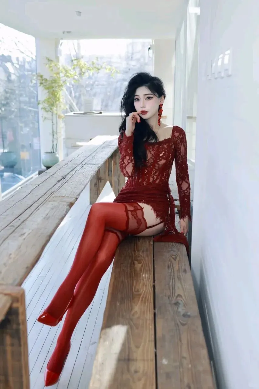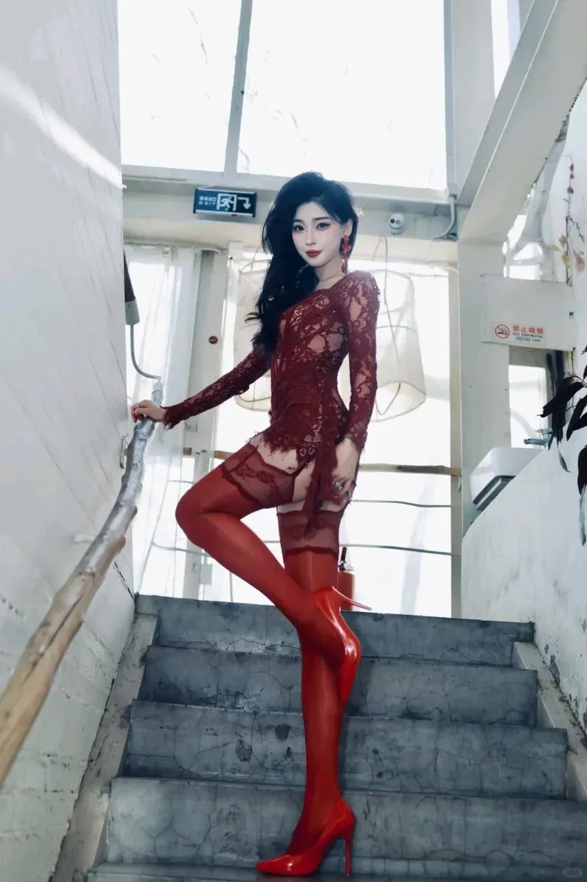 同色系的搭配是这场造型的灵魂:丝光红袜顺着腿型延伸,蕾丝袜边与裙身花纹恰好呼应,像同一块布料裁出的韵律;漆皮红高跟则是点睛的 “亮”,光滑鞋面反射的光泽,让哑光蕾丝多了几分明艳的锐度,一柔一刚间,把红色的张力拉满。
