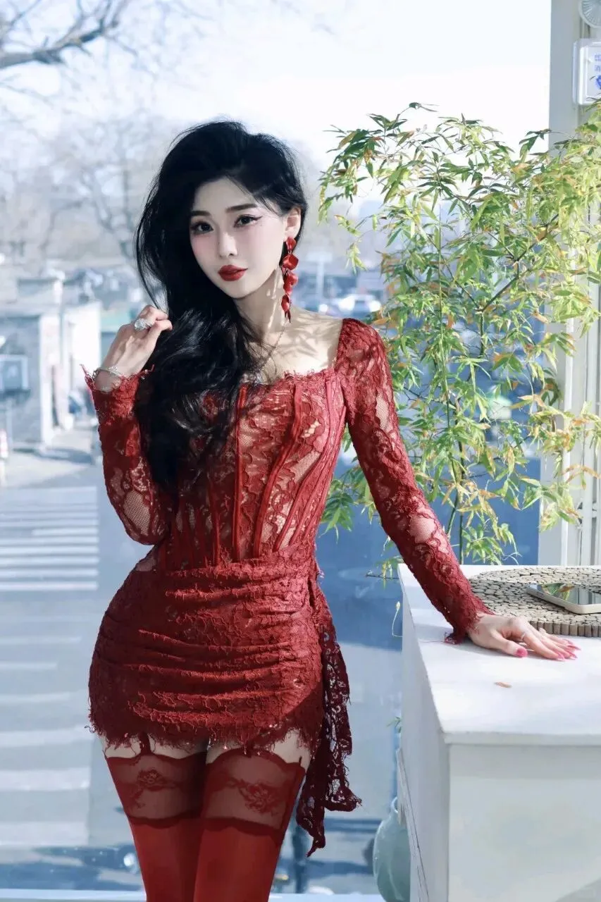 裙装以通体蕾丝为骨,酒红底色晕开哑光的高级感,镂空花纹像暗夜里舒展的藤蔓,既裹住了身形的曲线,又借透肤面料晕出朦胧的柔雾感 —— 长袖的设计是妙笔,摒弃了短裙的轻佻,用细密的蕾丝纹路牵起优雅的缰绳,而裙摆的不规则剪裁又悄悄漏出腰臀的起伏,把性感藏在精致的褶皱里。