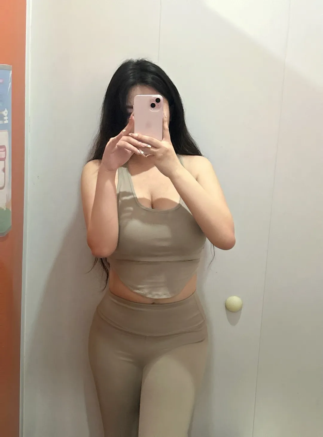 镜子前的身影被柔和光线温柔包裹,浅卡其色的运动套装衬得肌肤愈发细腻。短款吊带背心是流畅的U型领口,下摆自然垂落露出纤细腰肢,高腰瑜伽裤紧密贴合曲线,同色系的搭配浑然一体,透着简约的高级感。双手举着粉色手机轻抵面前,指尖的白色美甲在光线下泛着细腻光泽,黑色长发如瀑般垂落肩头,发梢带着些许自然的蓬松弧度。