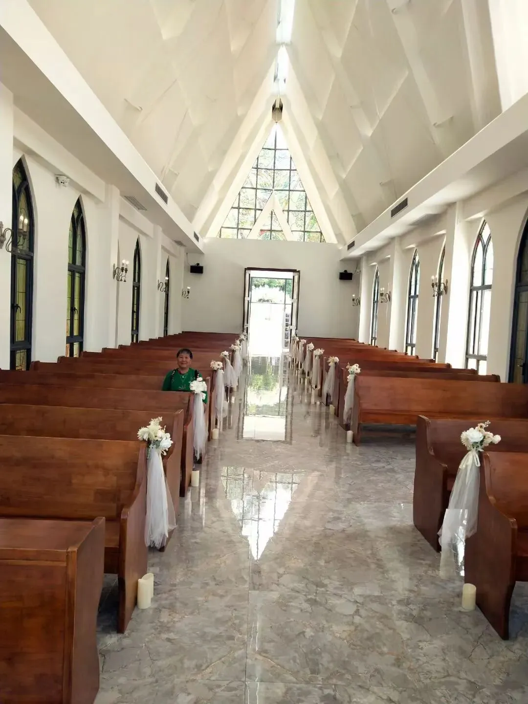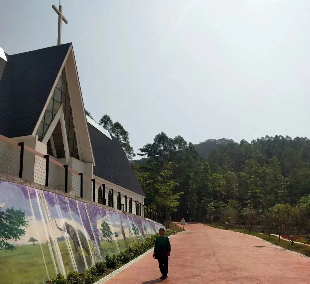 那里有个教堂值得一看,它不是专门做礼拜的,而是一座样板教堂,里面陈设简单,两排椅子,台上一张大桌子,上面围罩着几捧鲜花,很漂亮的,外面颜色很清淡,是我喜欢的样子。