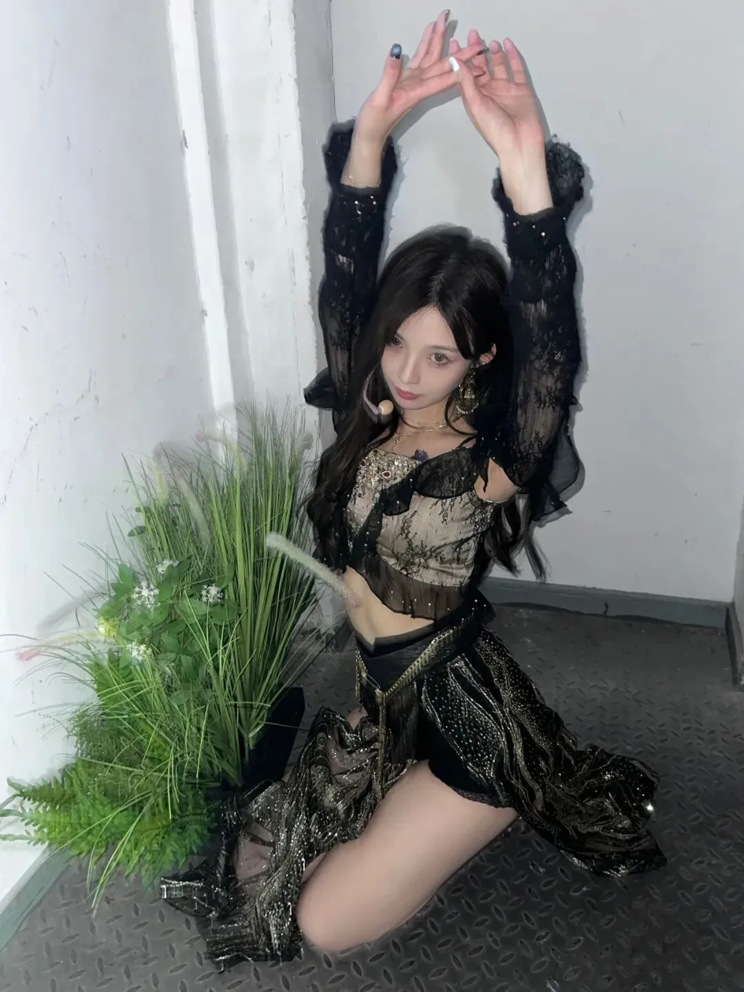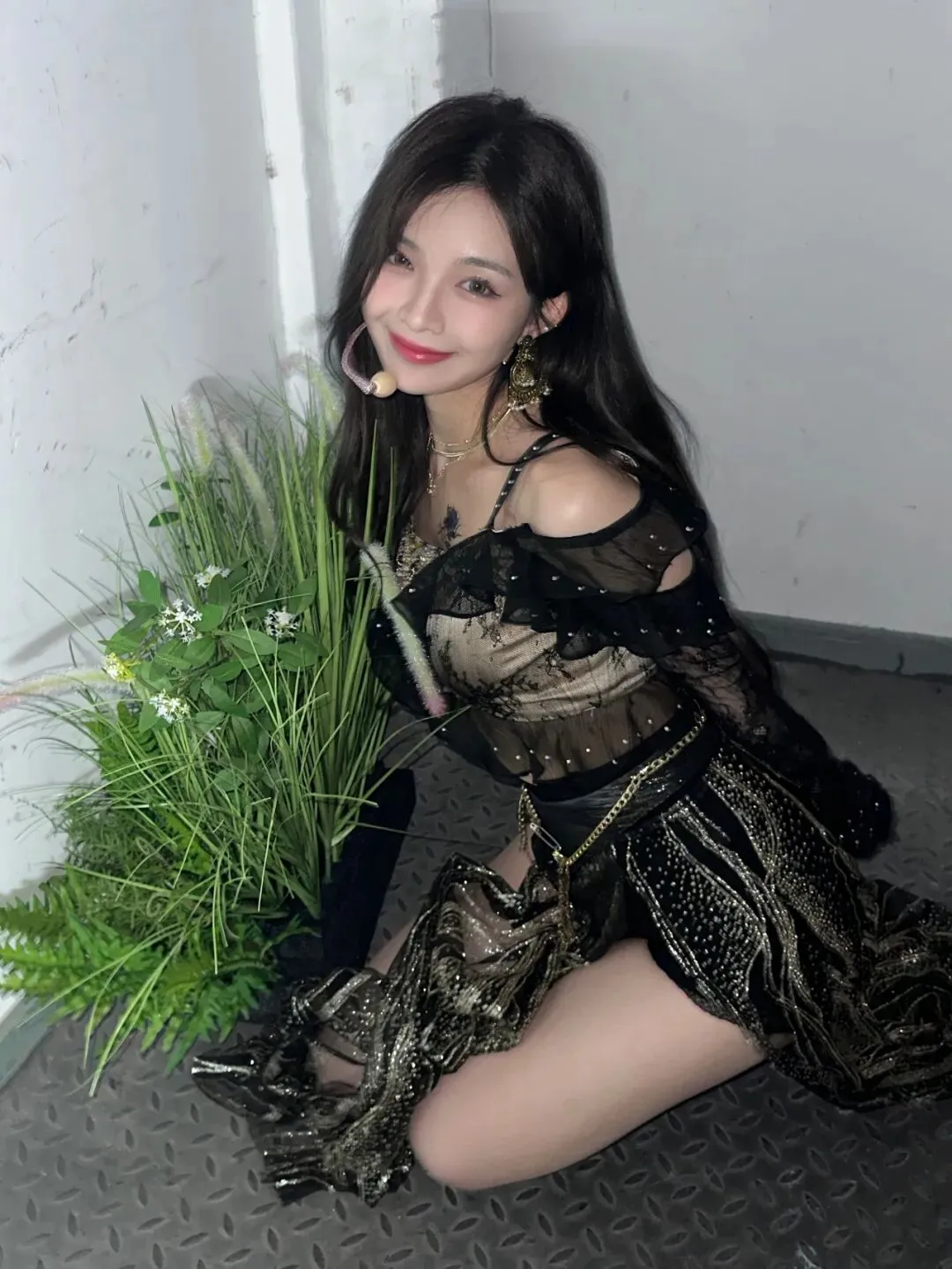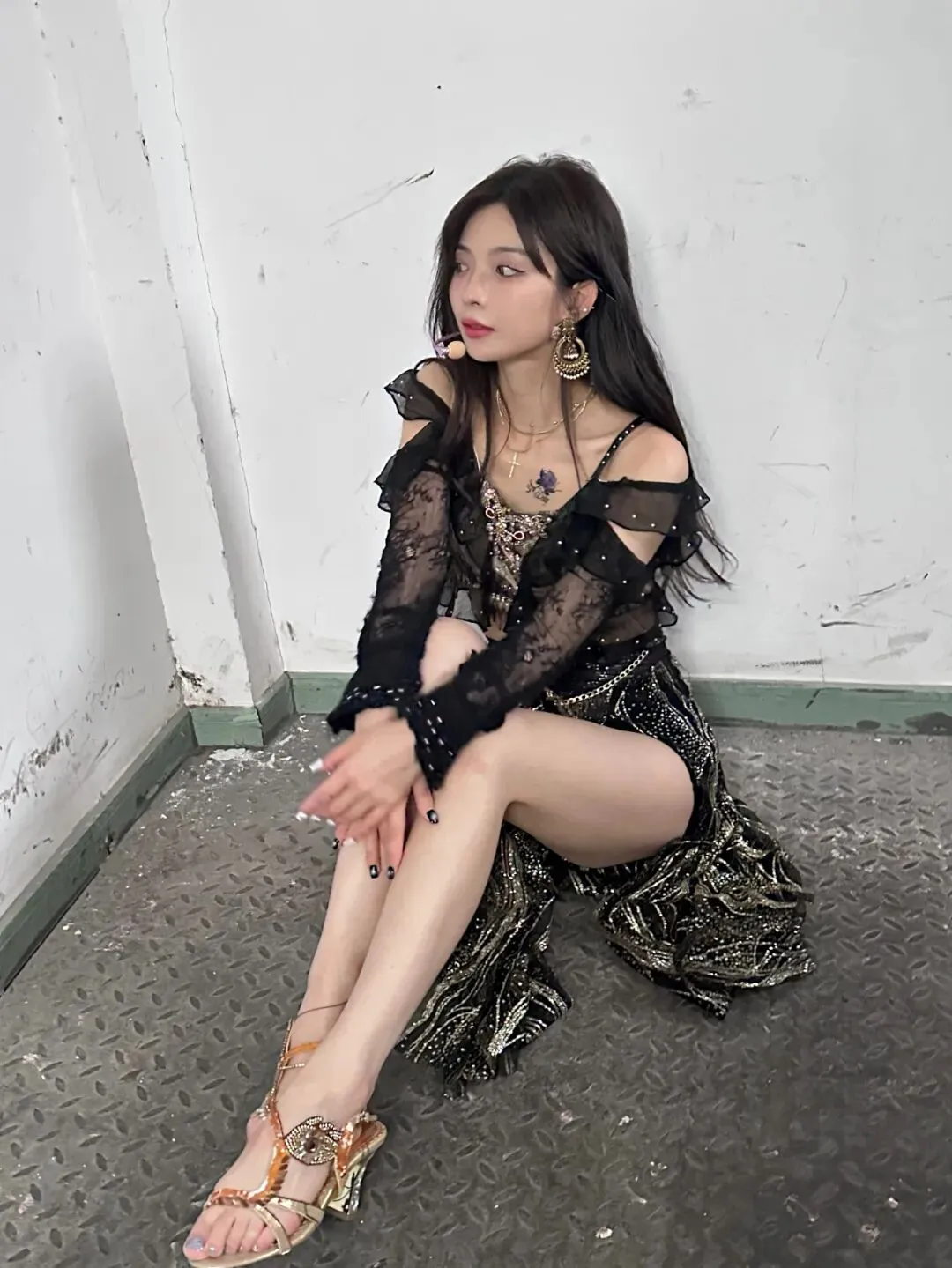 许杨玉琢这组照片也太绝了!黑金色蕾丝露肩上衣透着小性感,搭配闪着细碎光泽的流苏裙装,同色系高跟凉鞋衬得双腿又细又直。她长发垂肩,红唇妆容亮眼,蹲在墙角的姿态带着松弛又酷飒的劲儿,又甜又A,完全是舞台下的氛围感美女!