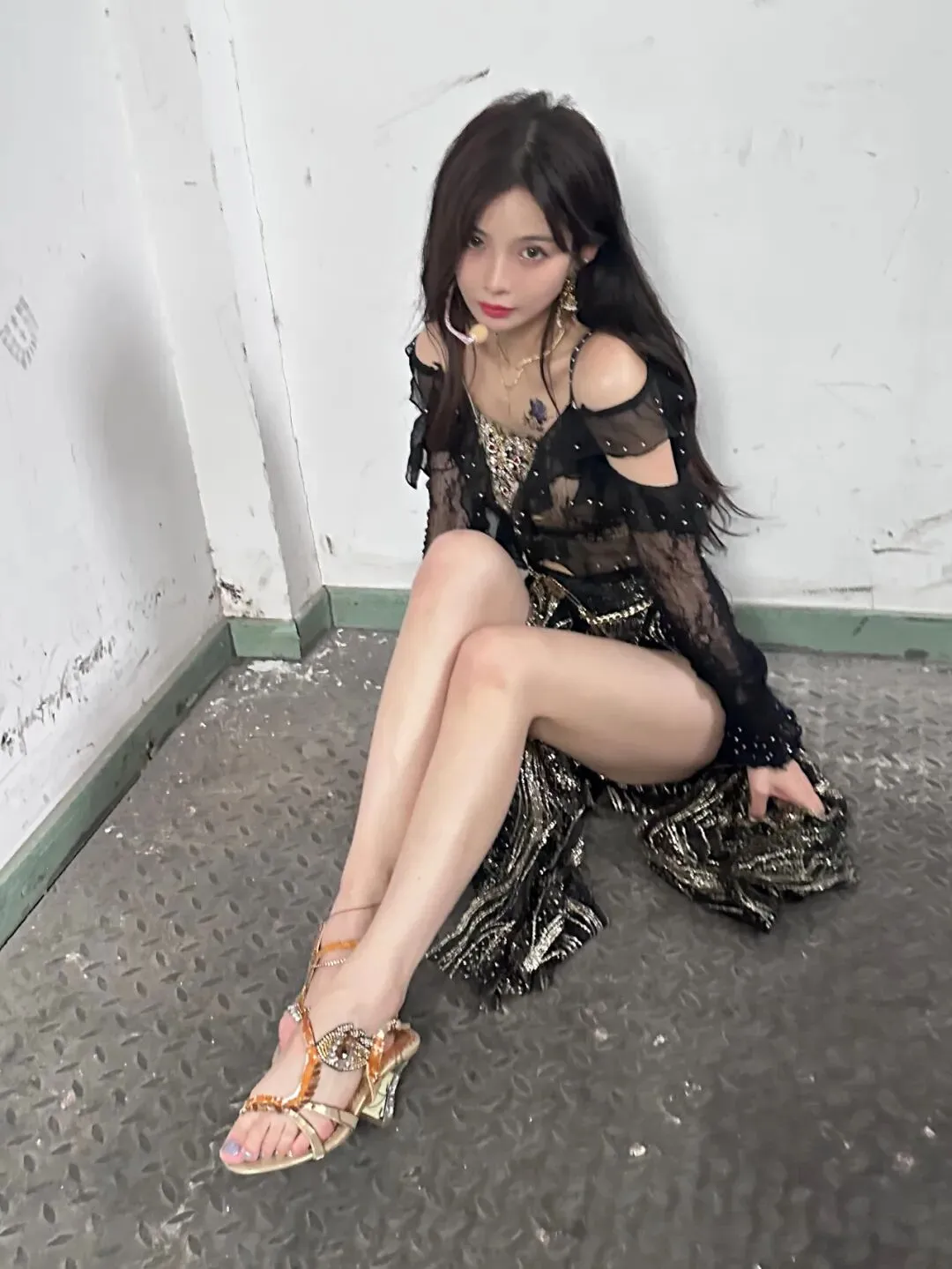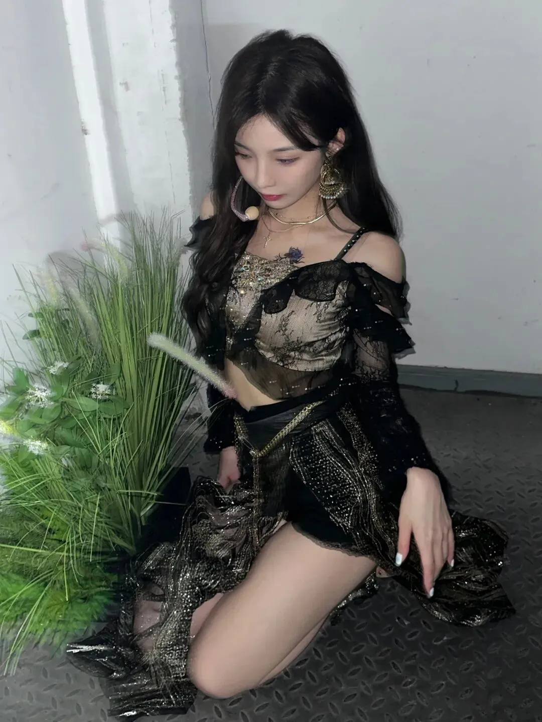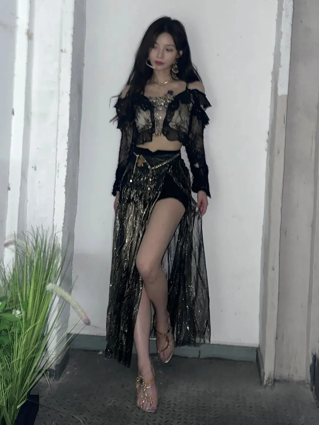 许杨玉琢这组照片也太绝了!黑金色蕾丝露肩上衣透着小性感,搭配闪着细碎光泽的流苏裙装,同色系高跟凉鞋衬得双腿又细又直。她长发垂肩,红唇妆容亮眼,蹲在墙角的姿态带着松弛又酷飒的劲儿,又甜又A,完全是舞台下的氛围感美女!