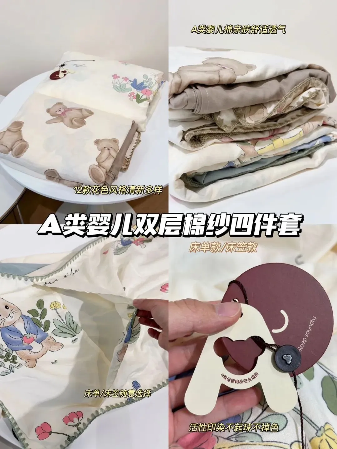 品质不变‼️还是原渠道!认准我们⚠️热卖2万套的A类母婴级【高品质水洗棉双层纱④件套 】春夏秋款,超舒服!品质芜迪好! 床笠/床单,②种可选‼️ ✅A类级别!水洗双层纱,柔软、透气、舒适、吸汗,一年④季可用 ✅钩花③角针包边,软糯精致 ✅12种图案款式,每款都钞级好看