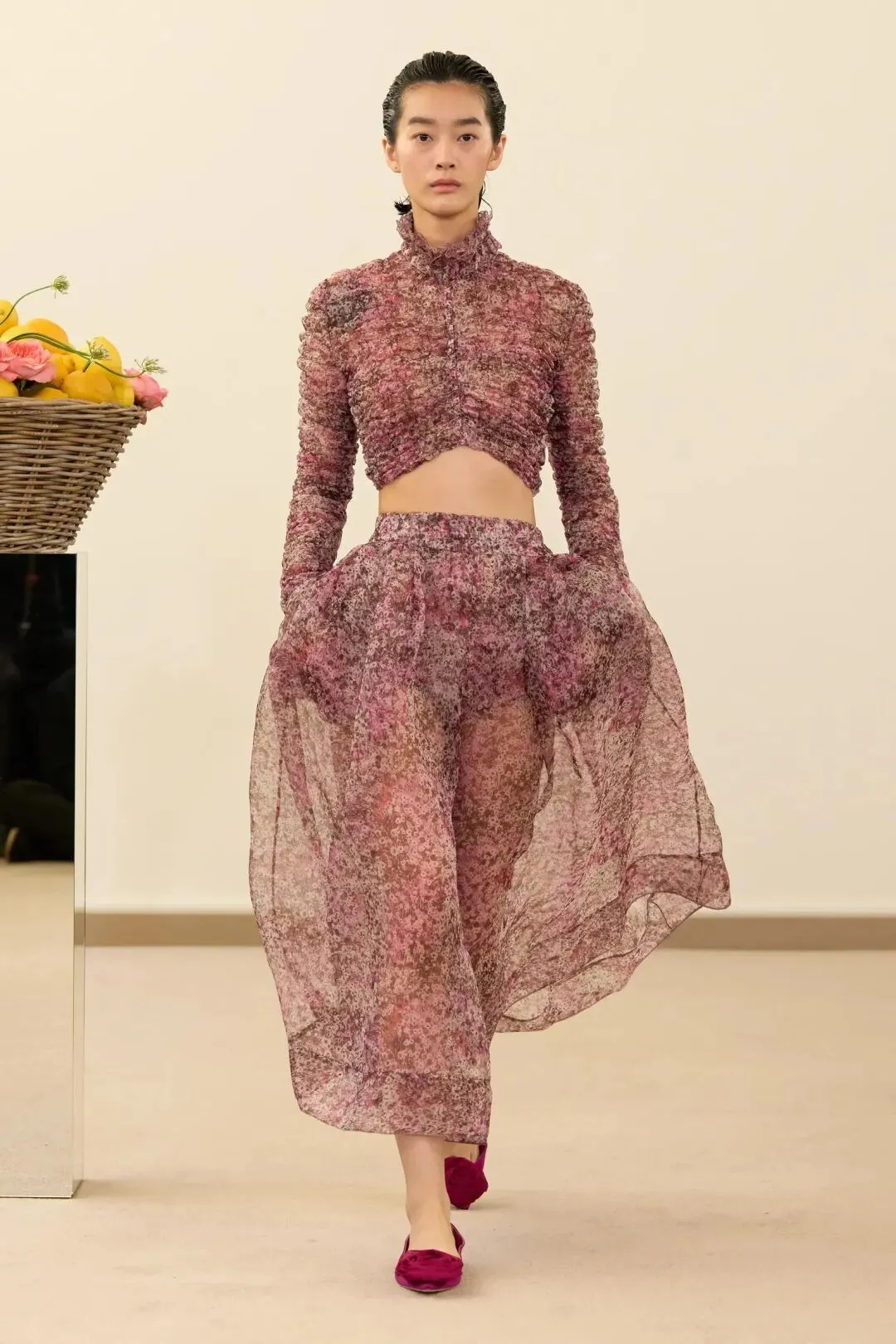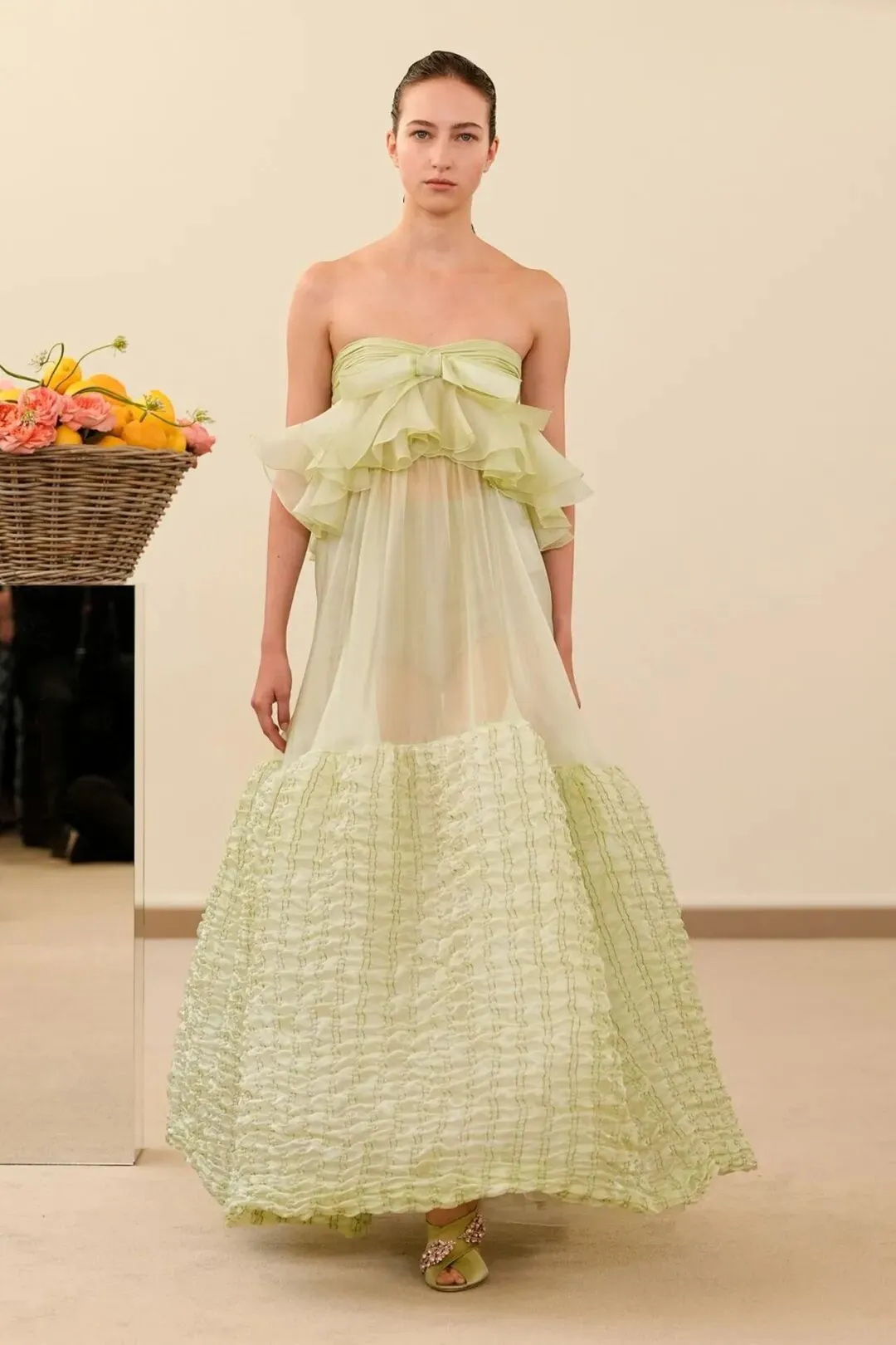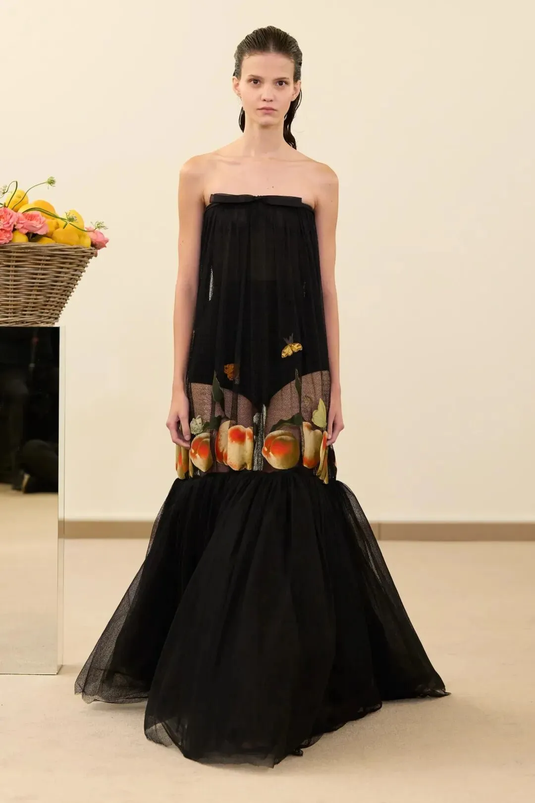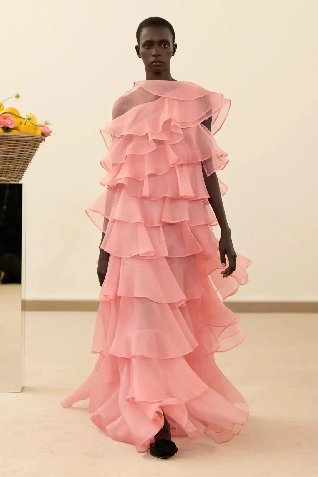 秀场镜面基座上盛放的鲜花与鲜果篮筐,瞬间将观众带入17世纪荷兰静物画的世界。这不是一场传统意义上的时尚大秀,而是设计师詹巴蒂斯塔·瓦利为疲惫现代人打造的一场心灵疗愈仪式。
