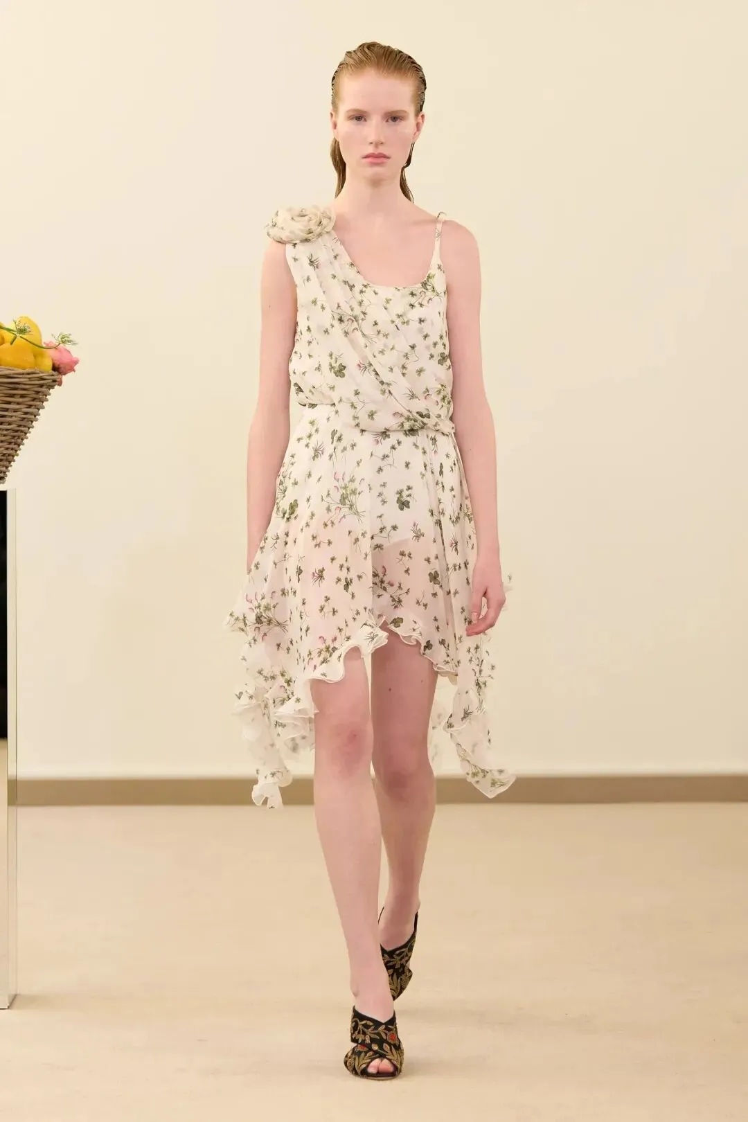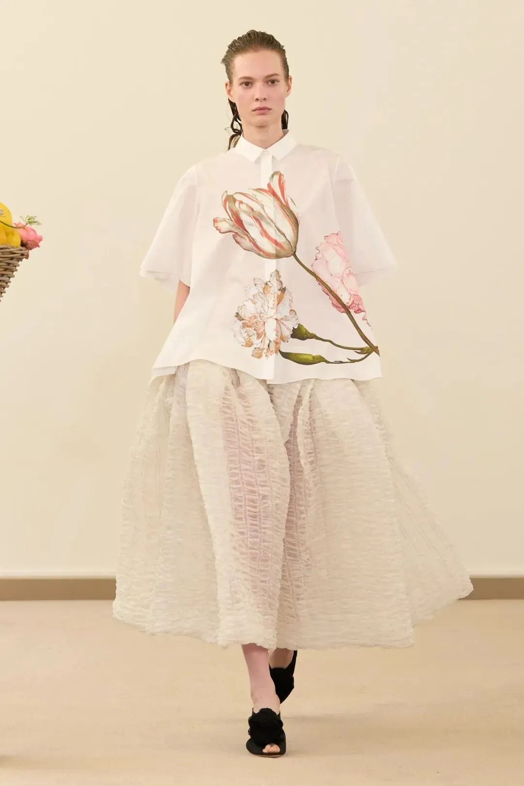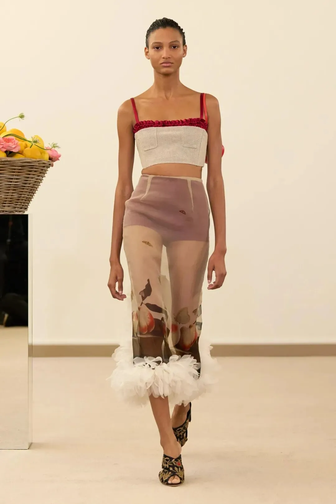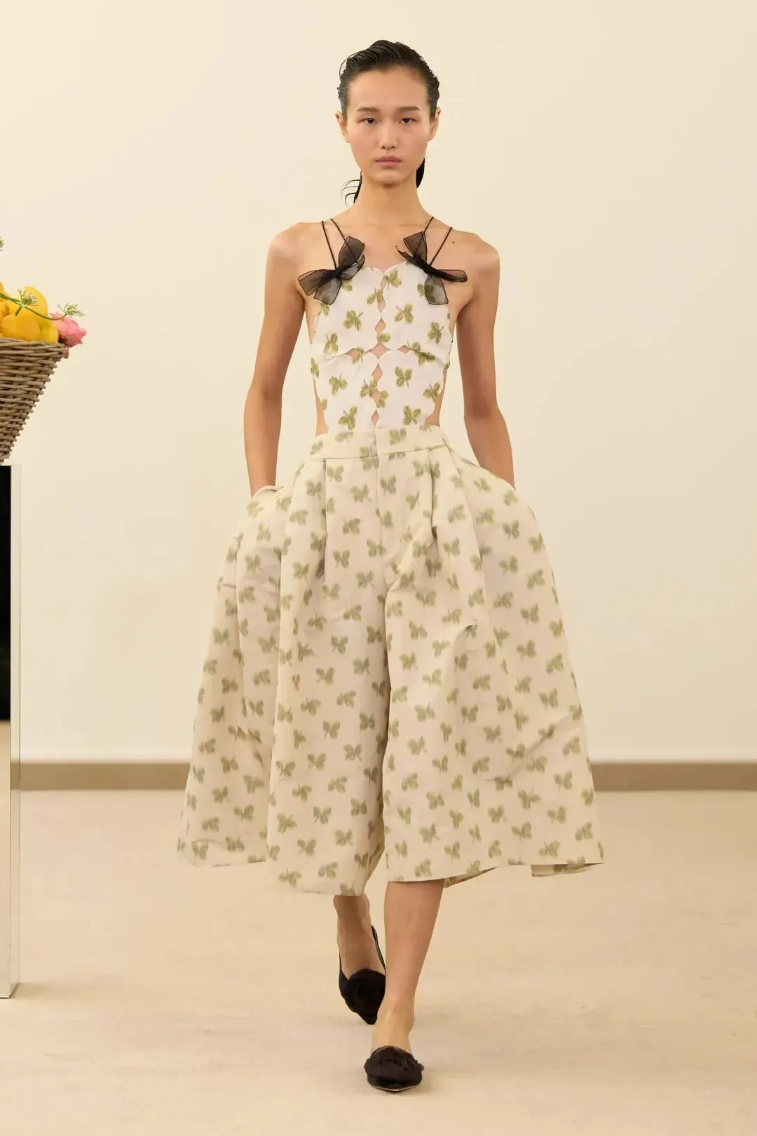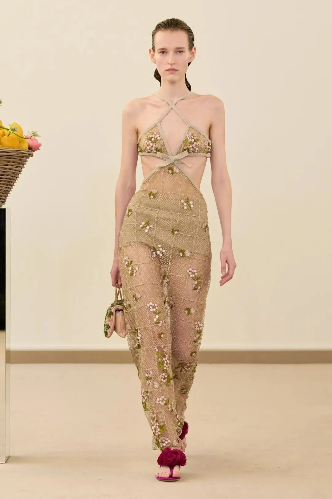 秀场镜面基座上盛放的鲜花与鲜果篮筐,瞬间将观众带入17世纪荷兰静物画的世界。这不是一场传统意义上的时尚大秀,而是设计师詹巴蒂斯塔·瓦利为疲惫现代人打造的一场心灵疗愈仪式。