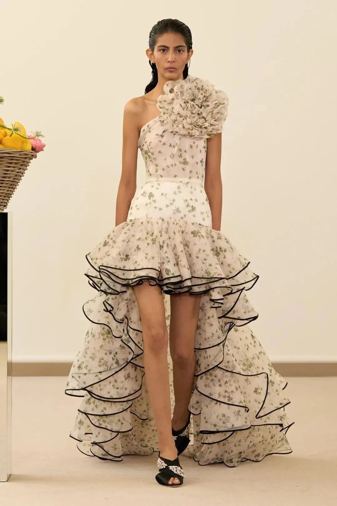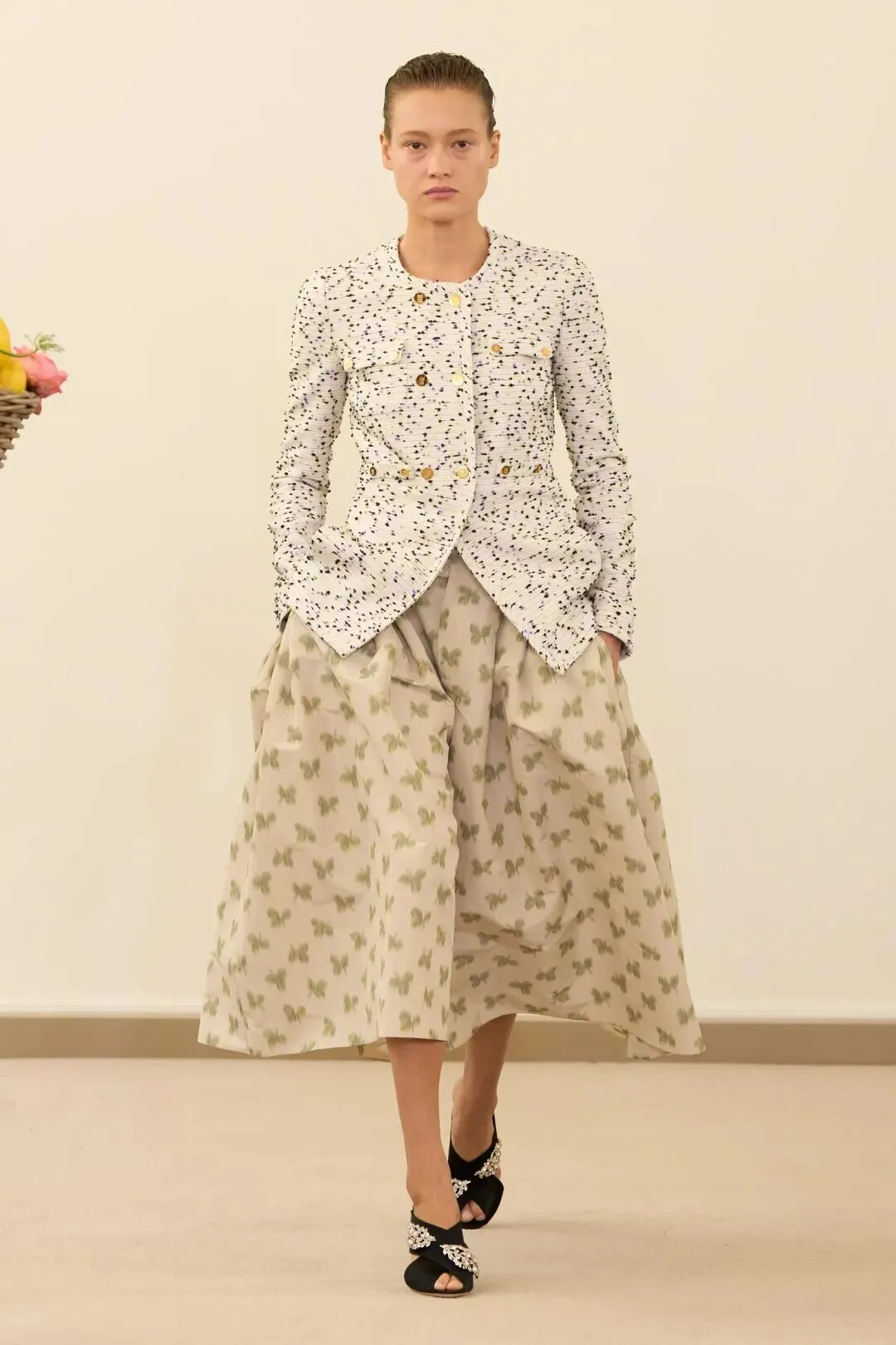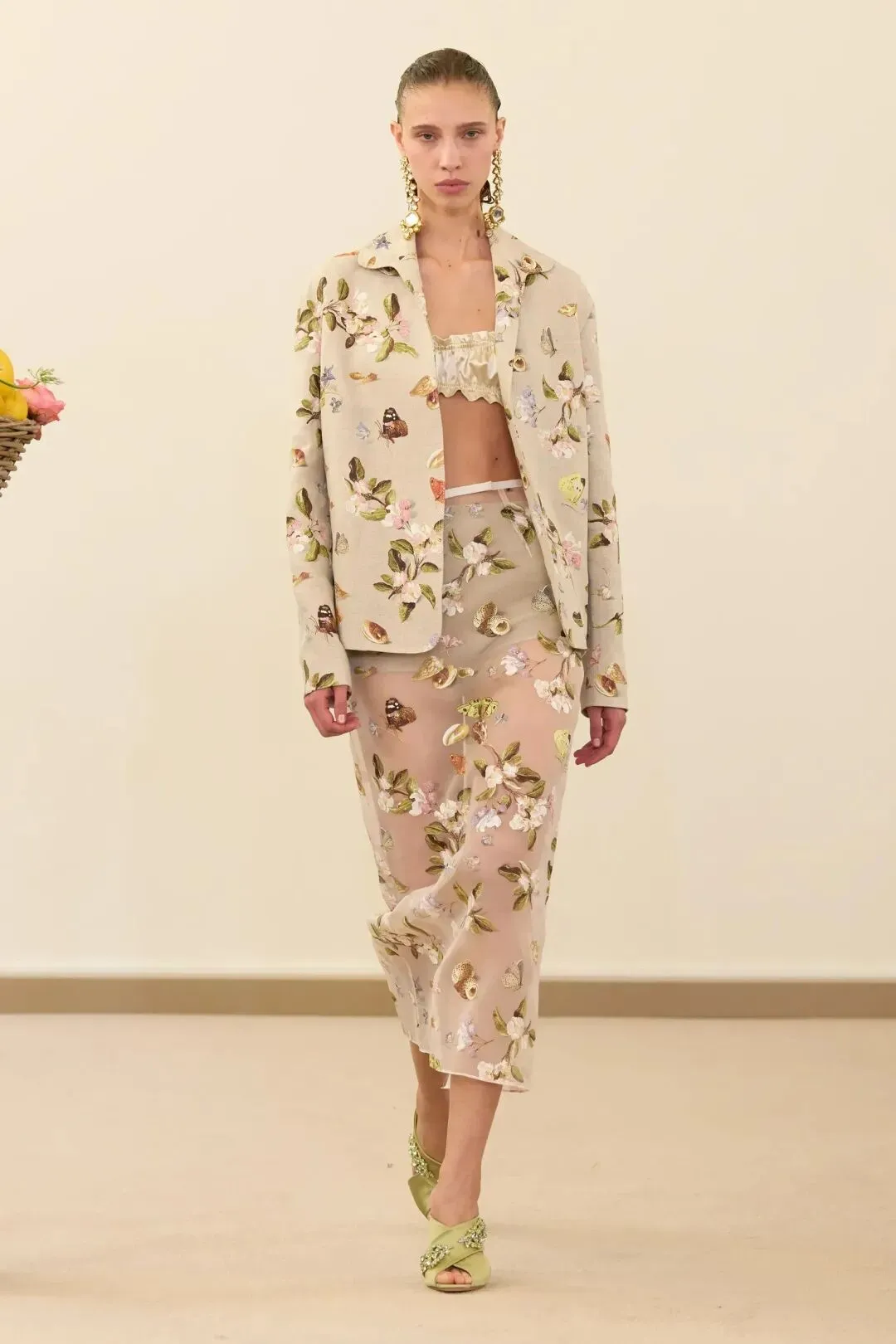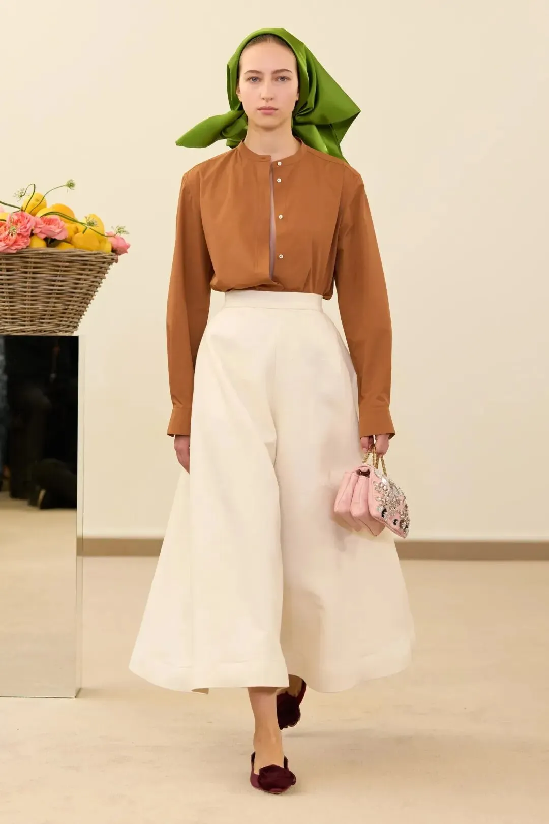 秀场镜面基座上盛放的鲜花与鲜果篮筐,瞬间将观众带入17世纪荷兰静物画的世界。这不是一场传统意义上的时尚大秀,而是设计师詹巴蒂斯塔·瓦利为疲惫现代人打造的一场心灵疗愈仪式。