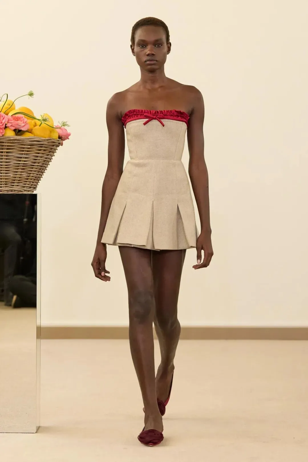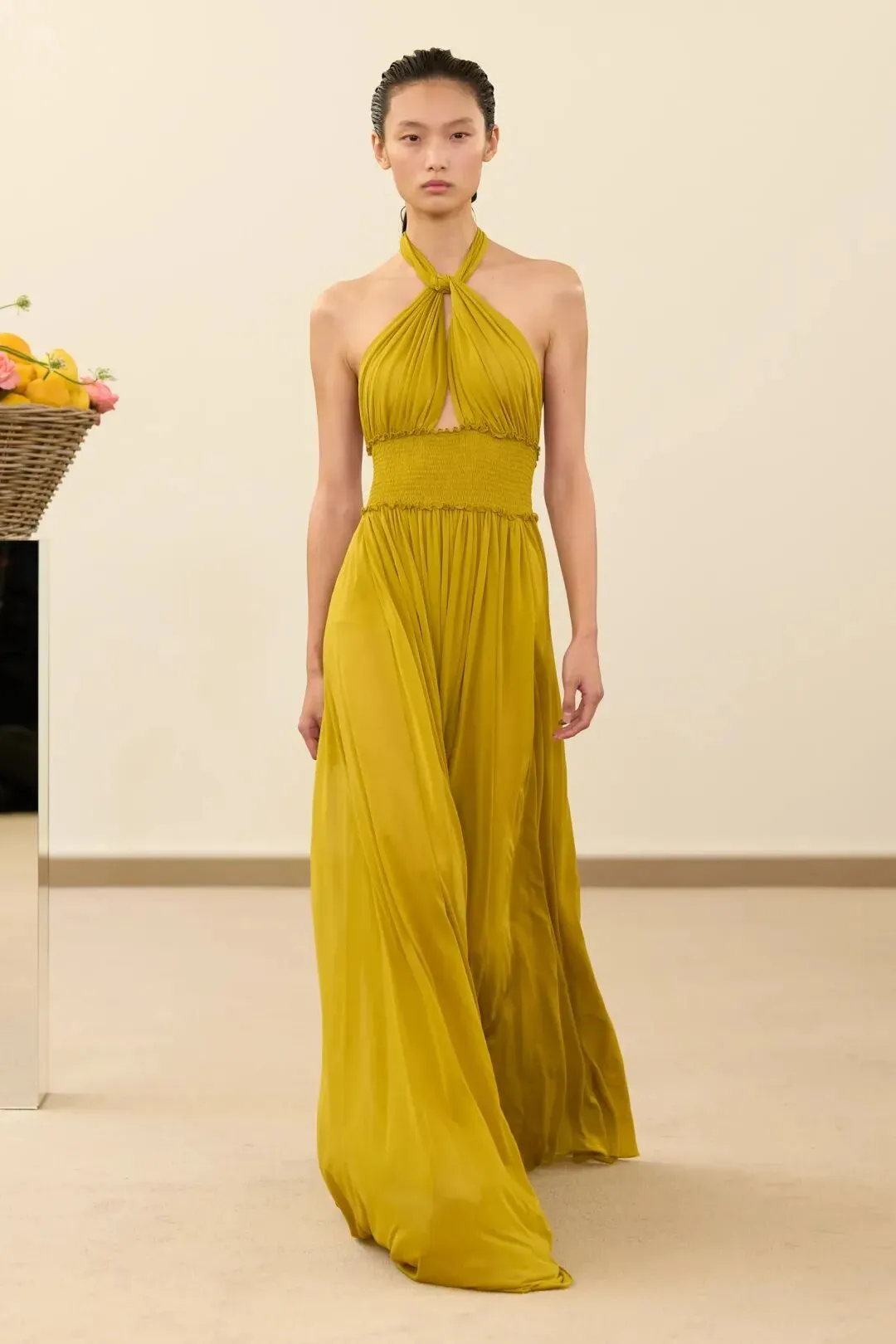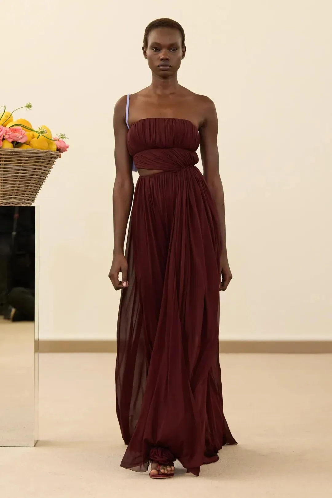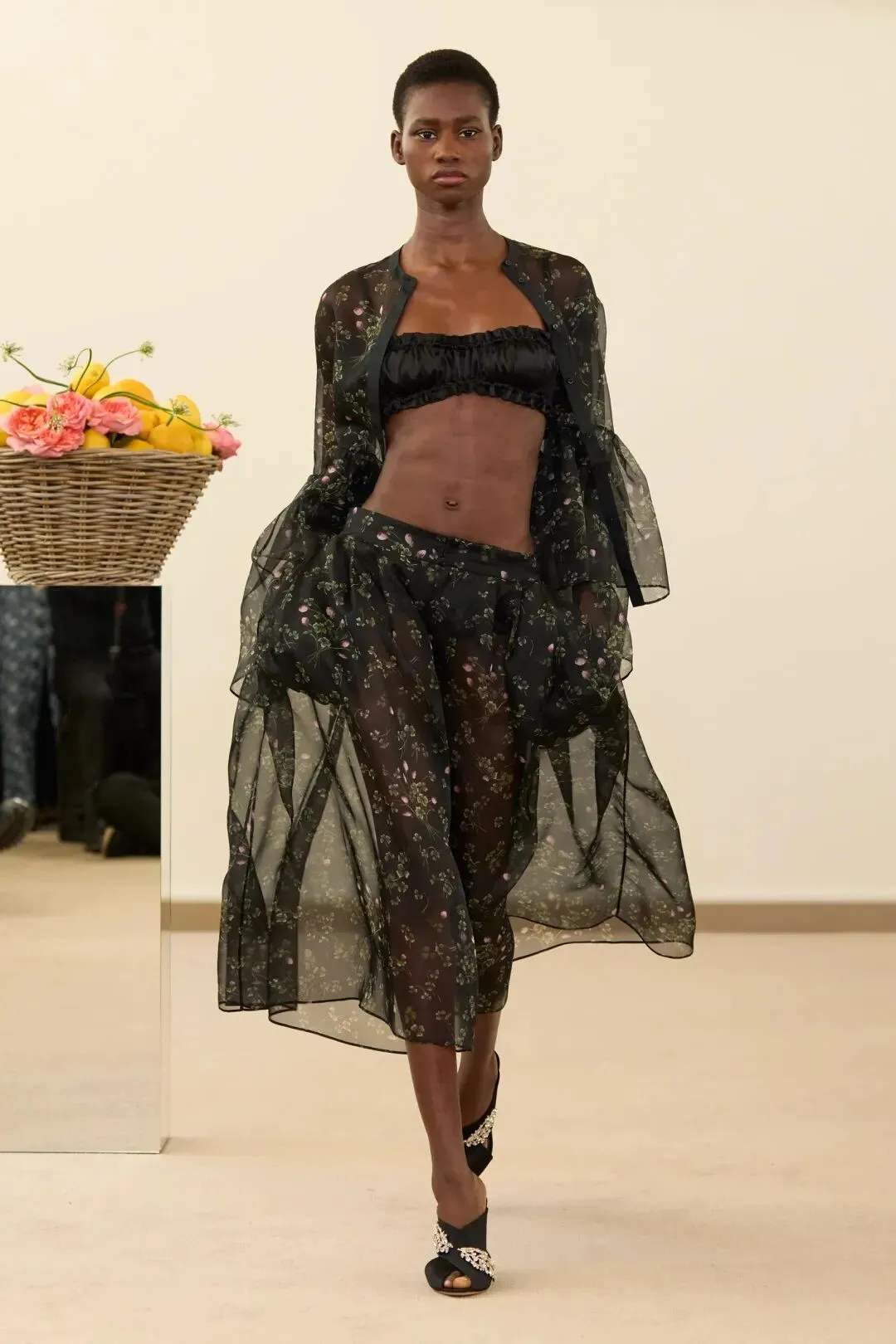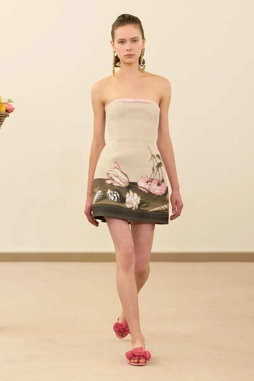 秀场镜面基座上盛放的鲜花与鲜果篮筐,瞬间将观众带入17世纪荷兰静物画的世界。这不是一场传统意义上的时尚大秀,而是设计师詹巴蒂斯塔·瓦利为疲惫现代人打造的一场心灵疗愈仪式。