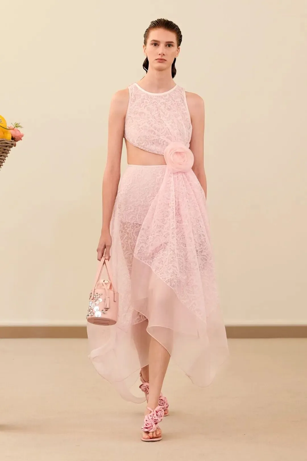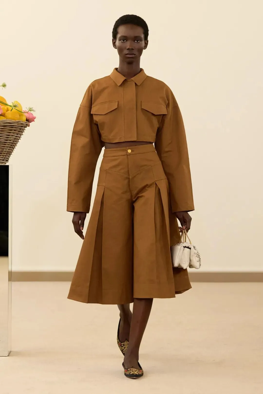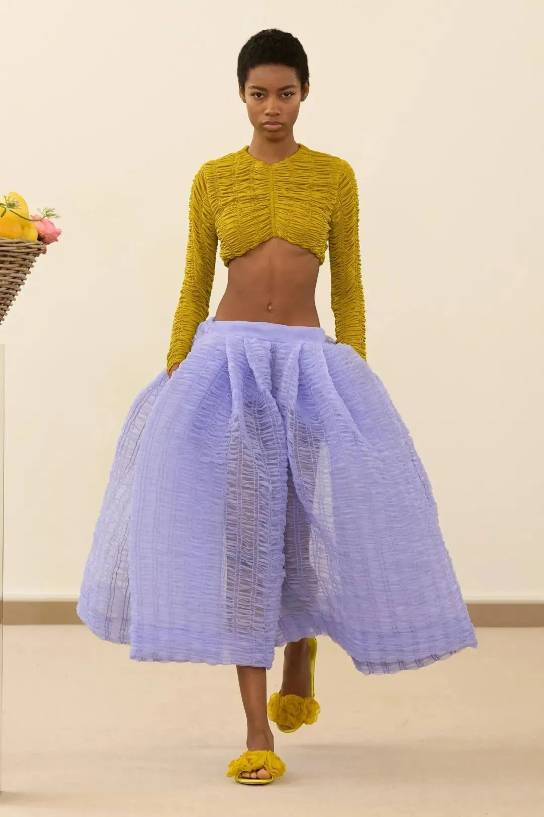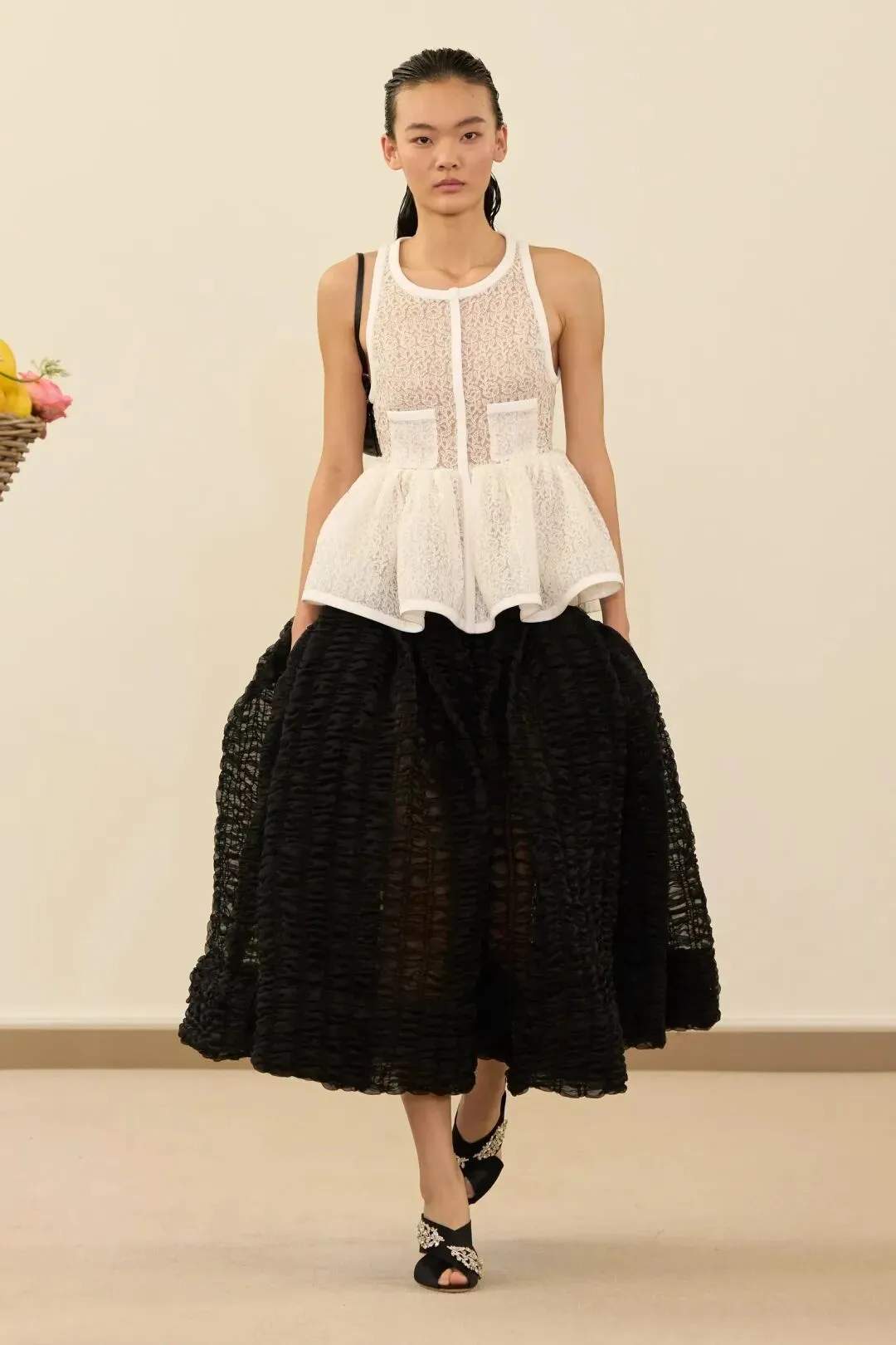 秀场镜面基座上盛放的鲜花与鲜果篮筐,瞬间将观众带入17世纪荷兰静物画的世界。这不是一场传统意义上的时尚大秀,而是设计师詹巴蒂斯塔·瓦利为疲惫现代人打造的一场心灵疗愈仪式。