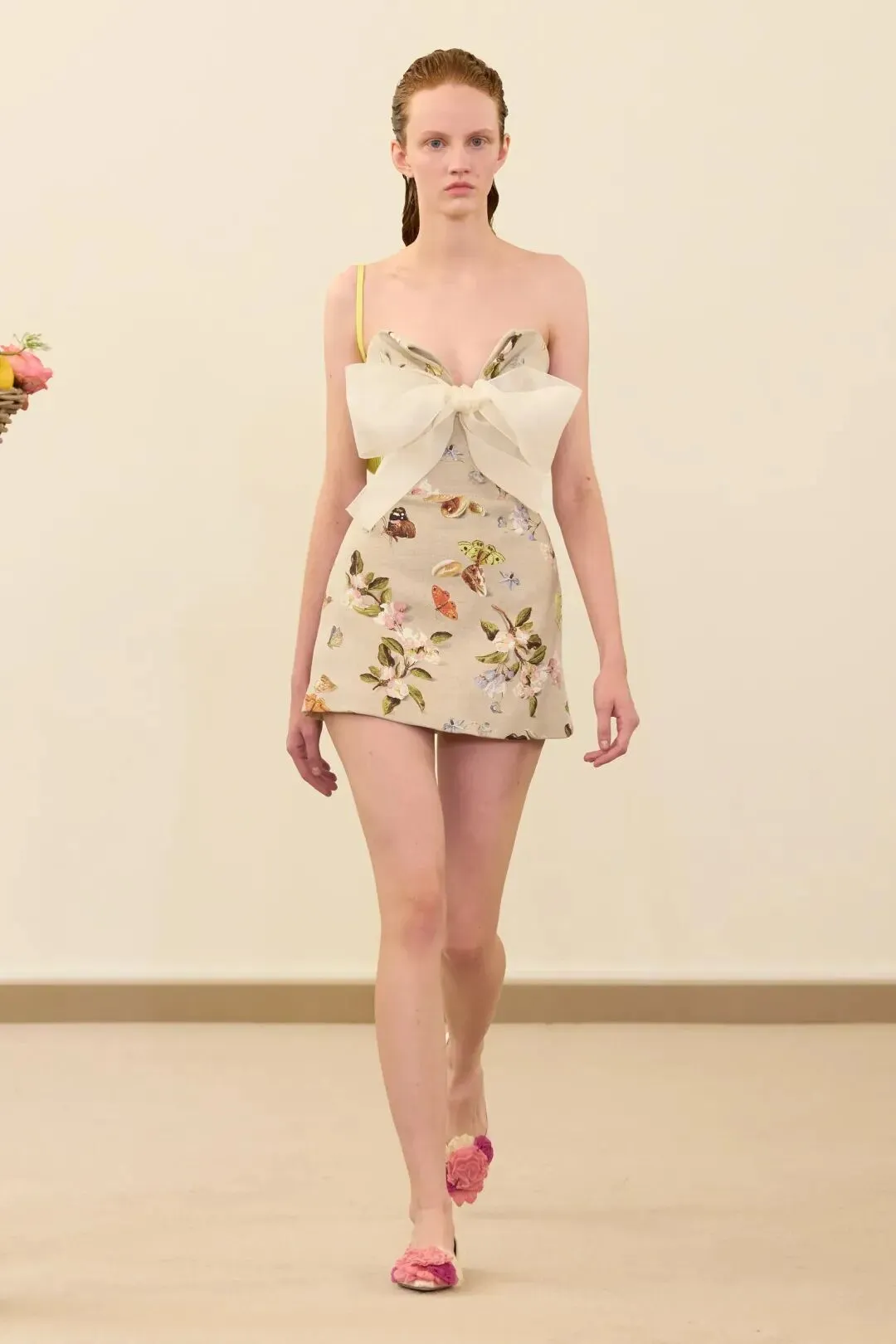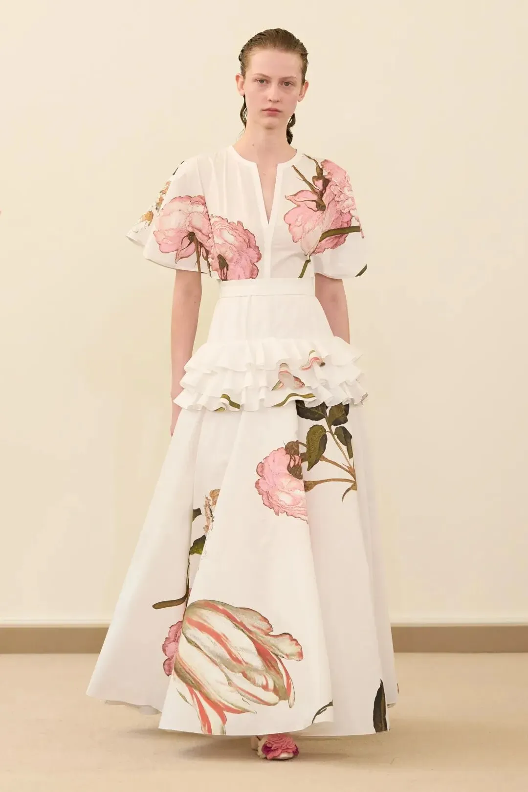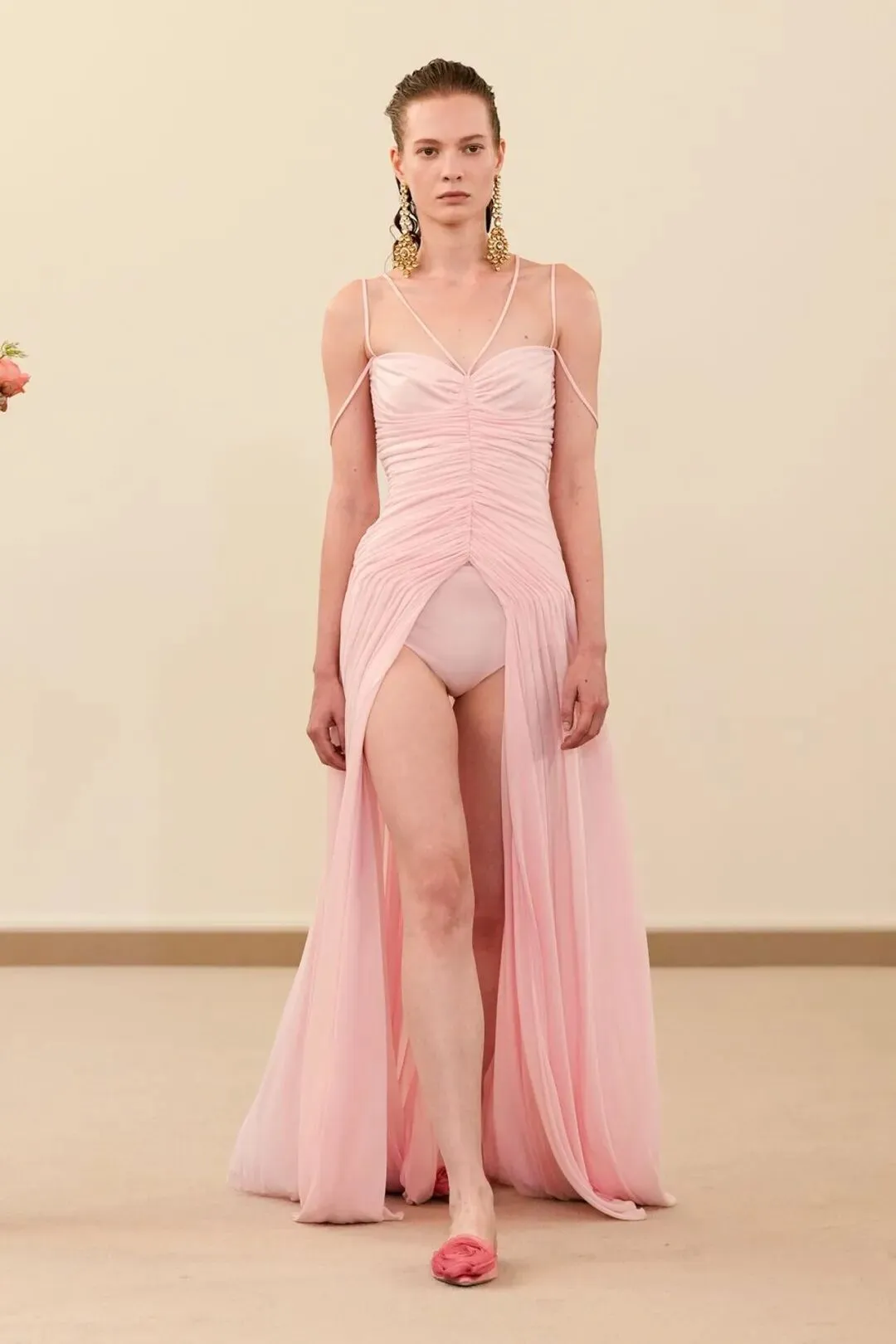 瓦利放弃了高跟鞋,以平底鞋作为主要鞋履,包括亮粉色拖鞋和芭蕾舞鞋等款式,上面点缀着三维立体花卉。这一选择体现了“真正的自信不需要高度来撑,松弛感才是最高级的奢侈”的设计理念。