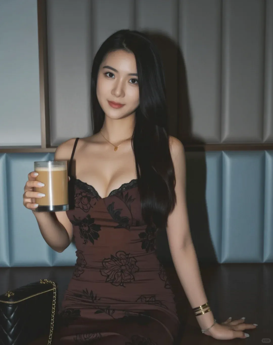 主体与身材:年轻亚洲女性,长直黑发(中分垂肩,hair falling naturally over shoulders),S型身材(emphasize curvy silhouette),妆容精致(natural makeup with defined eyes + soft pink lips) 服饰细节:深棕色吊带连衣裙(strapless dress in dark brown),低胸设计(plunging neckline,突出胸部曲线),蕾丝材质+暗纹花卉(lace texture with subtle floral patterns),包身剪裁(bodycon fit,贴合腰臀线条) 配饰与道具:纤细金色项链(delicate gold choker),金色宽版手镯(gold bangle on right wrist),银色细手链(silver bracelet on left wrist);透明玻璃杯(cocktail glass with frothy light brown beverage,如咖啡或鸡尾酒);黑色菱格链条包(black quilted handbag with gold chain,经典奢侈品风格) 场景与背景:室内休闲场景(indoor lounge setting),灰色软包墙面(gray padded wall with vertical stitching,类似酒吧/会所卡座);深色桌面(dark table surface,放置玻璃杯) 光影与质感:低饱和暗调氛围(low-saturation dark tones),聚光打亮面部与上半身(focused lighting on face + torso),写实胶片质感(photorealistic film grain),轻复古滤镜(subtle vintage filter)
