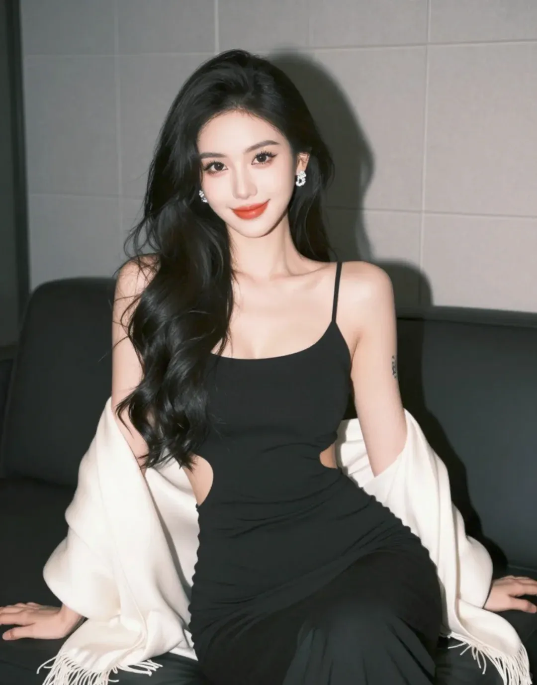 主体人物: 一位极其美丽的年轻亚洲女性,写真摄影,全身像,坐在黑色的现代风格沙发上,身体微微向右侧倾斜,姿态优雅,直视镜头,面带自信迷人的微笑。 面部特征: 精致的五官,瓜子脸,深邃的眼眸,浓密卷翘的睫毛,精心修饰过的眉毛,自然的裸妆质感,红润的嘴唇,皮肤白皙细腻,光泽感强。 发型: 一头乌黑亮丽的长卷发,大波浪卷,发丝蓬松有光泽,自然地披散在左肩后方。 服装与配饰: 服装: 穿着一件修身的黑色吊带长裙,细肩带设计,突出肩颈线条。胸前正中央有一个镂空设计,上面贴着一张美元纸币图案的装饰贴纸(或者是印有美元图案的胸贴),这是画面的视觉焦点。 首饰: 左耳佩戴着一对闪亮的钻石耳坠,设计感十足。 纹身: 左臂内侧(手肘附近)有一个黑色的纹身图案(看起来像是一个字母或符号,位于前臂内侧)。 披肩: 肩上随意搭着一条米白色或浅香槟色的丝质披肩/围巾,带有流苏边,增加了画面的柔和感和层次感。 光影与氛围: 光线: 室内摄影布光,光线从左前方打来,人物面部受光均匀,右侧和背景墙面有自然的阴影,增强了立体感。 背景: 现代简约风格的室内环境,背景是灰色的方形瓷砖墙面,线条硬朗,与人物的柔美形成对比。背景略微失焦,突出人物主体。 整体氛围: 时尚、性感、高贵、都市夜生活感,色彩对比鲜明(黑裙与白墙、白皮肤的对比)。