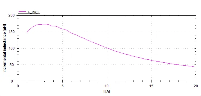 The inductance of this exemplar is higher than the nominal inductance in the complete range. Only the small-signal measurement method results in an inductance in the magnitude of the supplier rated inductance of approximately 71 µH. The real inductance is up to 2.5 times higher. After the maximum is reached the inductance decreases. In this case the rated current shows only the thermal limit of the choke.