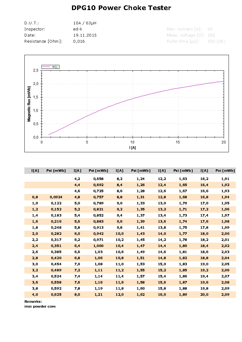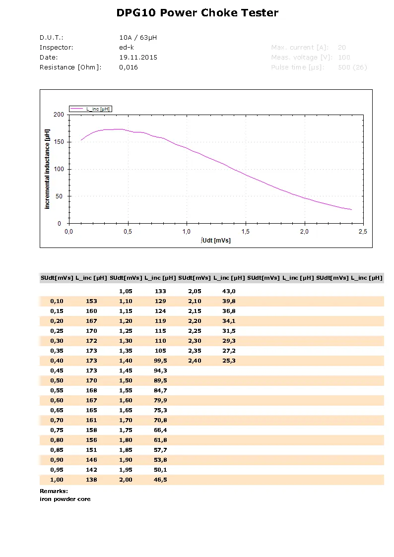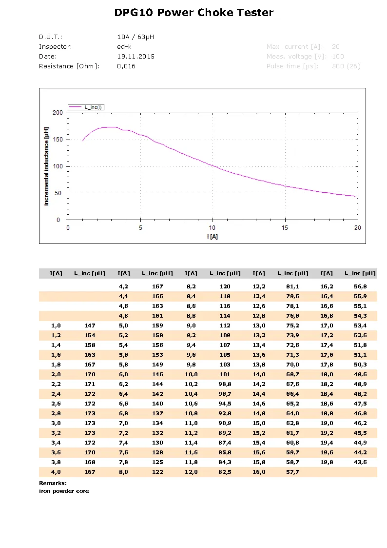 This example shows very clearly the differences between datasheet parameters and the real behaviours of the power inductor. With the Power Choke Tester DPG10 you can detect and show easily and prompt these deviations.