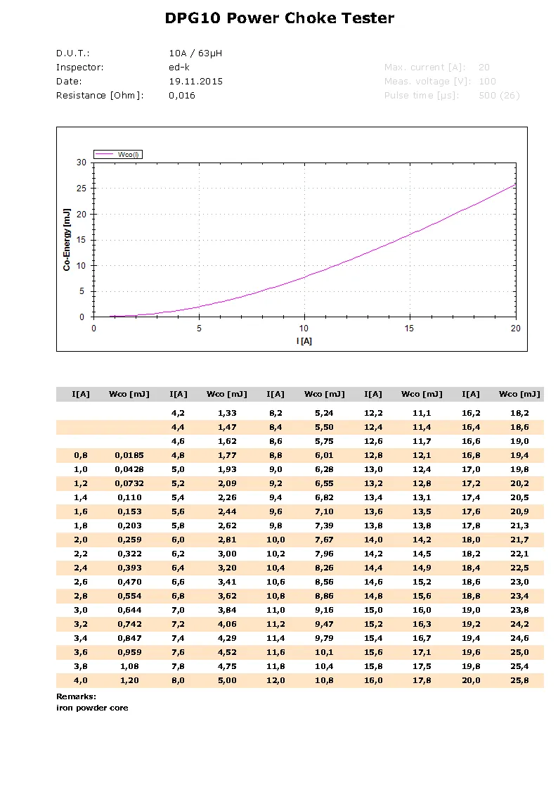 图六:一款标称10A/63µH的铁粉芯滤波扼流圈的磁共能曲线报告