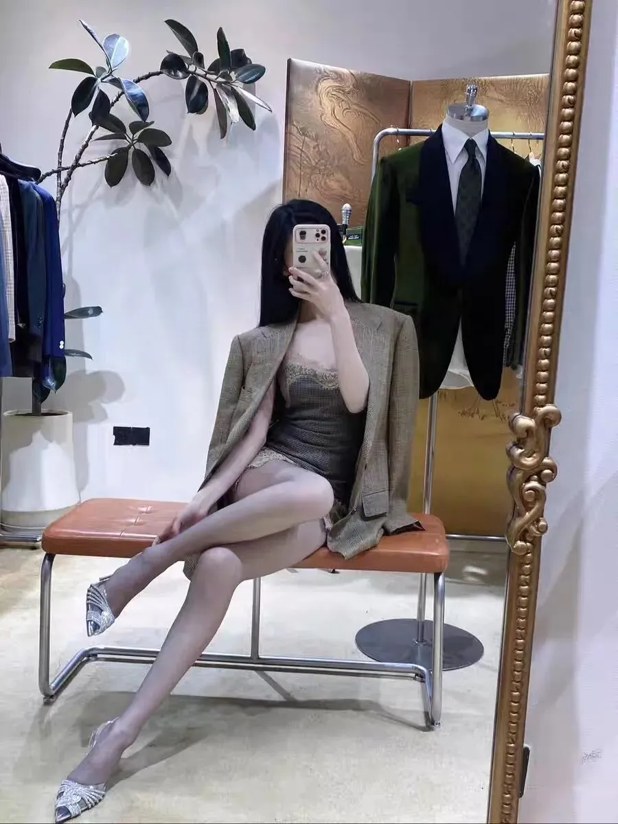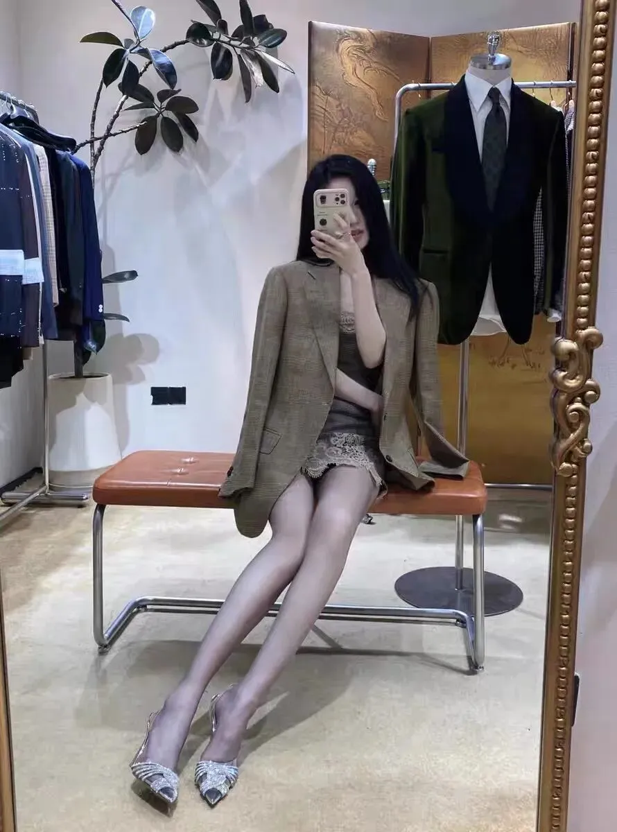 下装的浅灰丝袜与银色亮片高跟鞋,进一步强化了轻熟御姐的风格。薄款的灰丝通透朦胧,能隐约透出腿部肌肤,比黑丝少了几分张扬的性感,多了几分低调的撩人,与整体的复古格纹风格完美契合。银色亮片尖头高跟鞋的金属光泽,与蕾丝的柔美、西装的硬朗形成材质碰撞,冷调的银色提升了整体造型的精致度,尖头与细跟的设计拉长了腿部线条,让身形更显高挑,行走时的亮片细闪,又为御姐风增添了几分灵动的魅力。