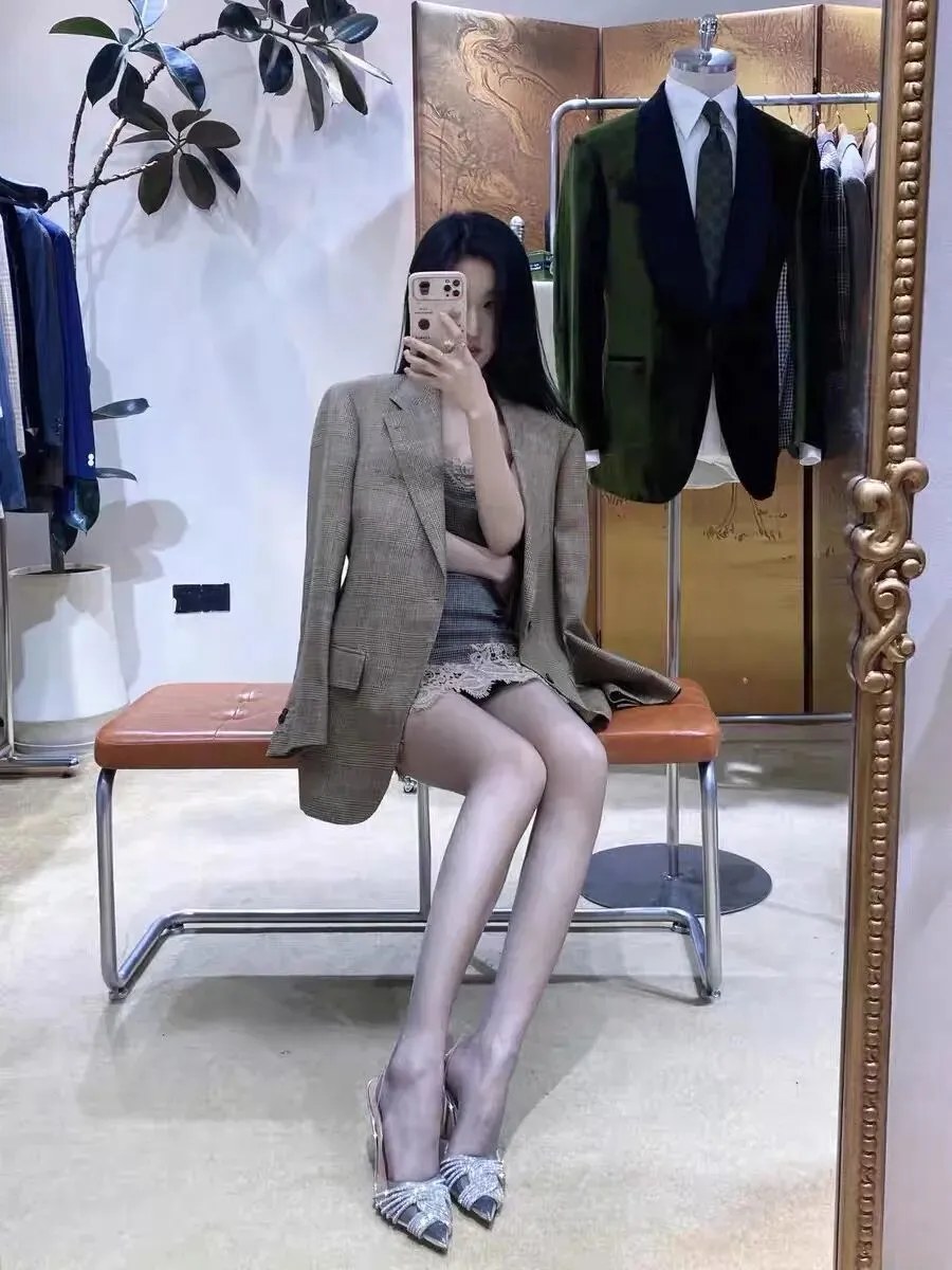 内搭的蕾丝格纹吊带是整套穿搭的性感密码,蕾丝的镂空肌理与格纹的复古质感结合,甜美的蕾丝中和了格纹的硬朗,让内搭多了几分妩媚的女性气息。修身的剪裁贴合身形,露出的肩颈与腰腹线条瞬间拉满性感氛围,深色调的格纹与西装的浅卡其格纹形成深浅对比,让造型的层次感更丰富。短款的设计与西装的宽松版型形成“下衣失踪”的视觉效果,为后续搭配丝袜埋下了撩人伏笔。