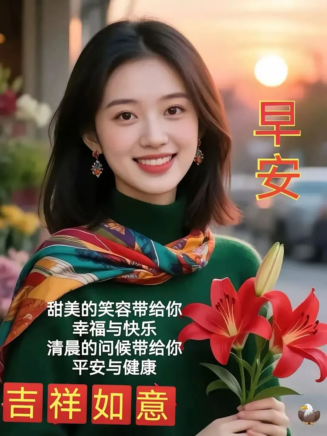 温馨的早晨,愿你身体健康,活力充沛,像朝霞般绽放着美丽;生活幸福,如绵绵暖阳温暖心田。吉祥伴随你,顺利与你同行,愿你的每一天都充满喜悦和美好的神奇!🌹🙏🌸🏝️💯🎉