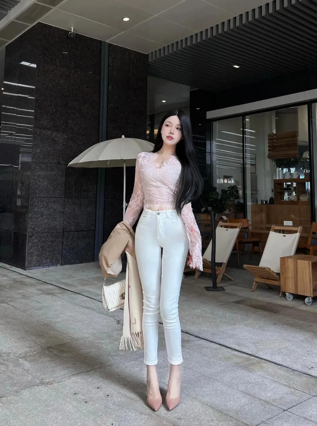 颜值穿搭:「浅粉色蕾丝上衣+白色牛仔裤+高跟」
