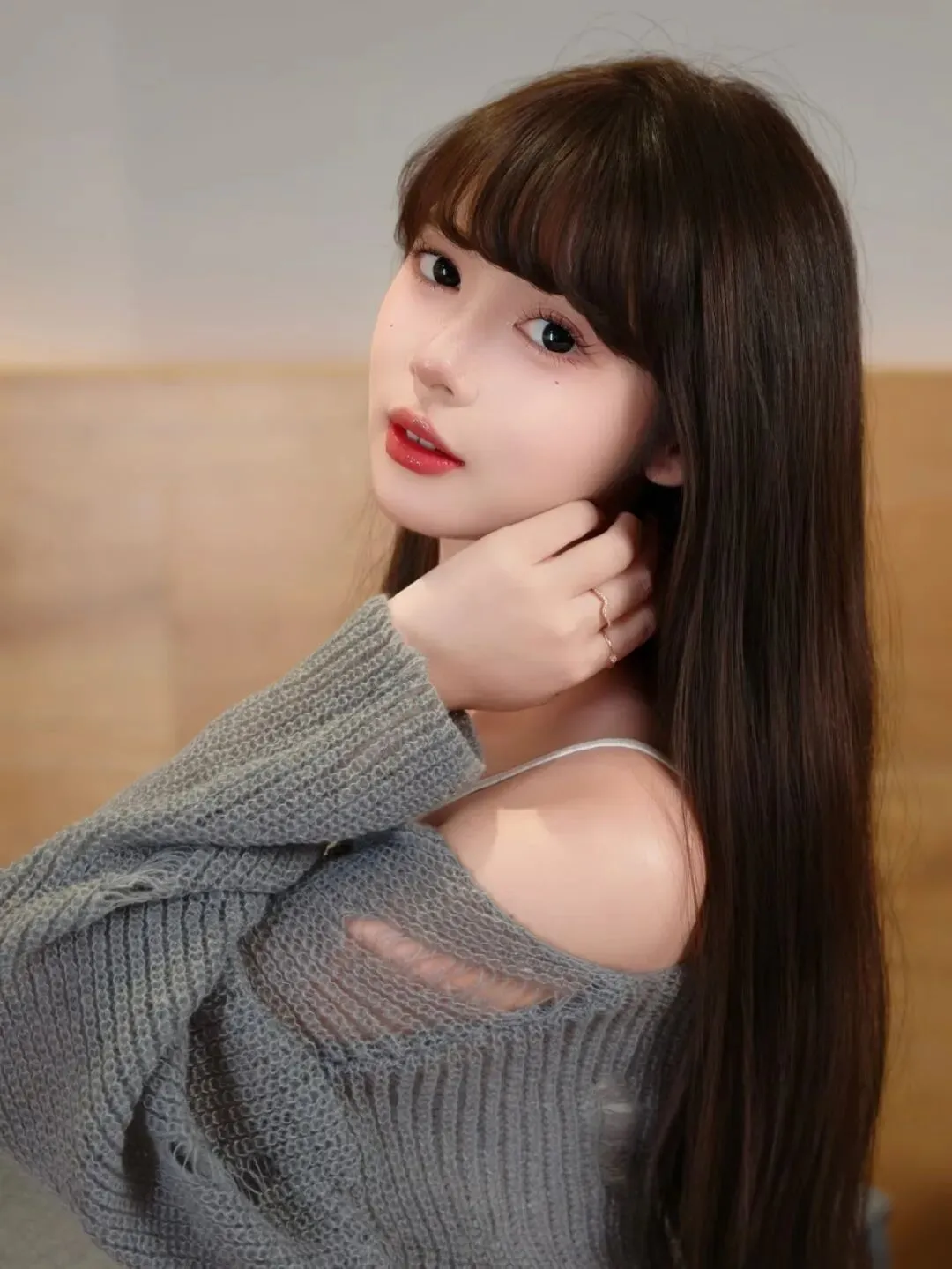 坐在卧室的置物架上,双腿自然弯曲着,一只手轻轻扯着衣摆带点随性感,身体稍微往一侧歪点,背景用洞洞板衬着,慵懒里还裹着点生活感的甜。